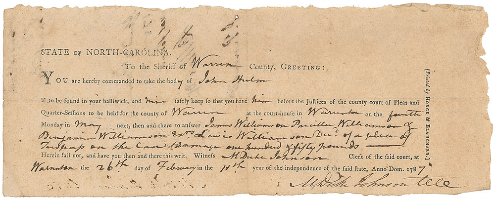 Partly-printed DS, signed on the reverse, “J. Penn atty,” one page, 10.5 x 4, February 26, 1787. Legal document filled out in Penn’s hand, with his writing represented by brackets in this text. In part: “To the Sheriff of [Warren] County, Greeting: You are hereby commanded to take the bod[y] of [John Hulm] if to be found in your bailiwick, and [him] safely keep so that you have [him]…at the court-house in [Warrenton] on the [fourth] Monday in [May] next, then and there to answer [James Williamson Priscilla Williamson & Benjamin Williamson Exrs Lewis Williamson Decd of a plea of Trespass on the case of Damage one hundred & fifty pounds].” Signed at the conclusion by Marmaduke Johnson, the Warren County clerk, and signed and docketed on the reverse by Penn. All together, the document contains over 40 words in Penn’s hand. In very good to fine condition, with a bit of show-through from docketing to reverse. Pre-certified PSA/DNA.