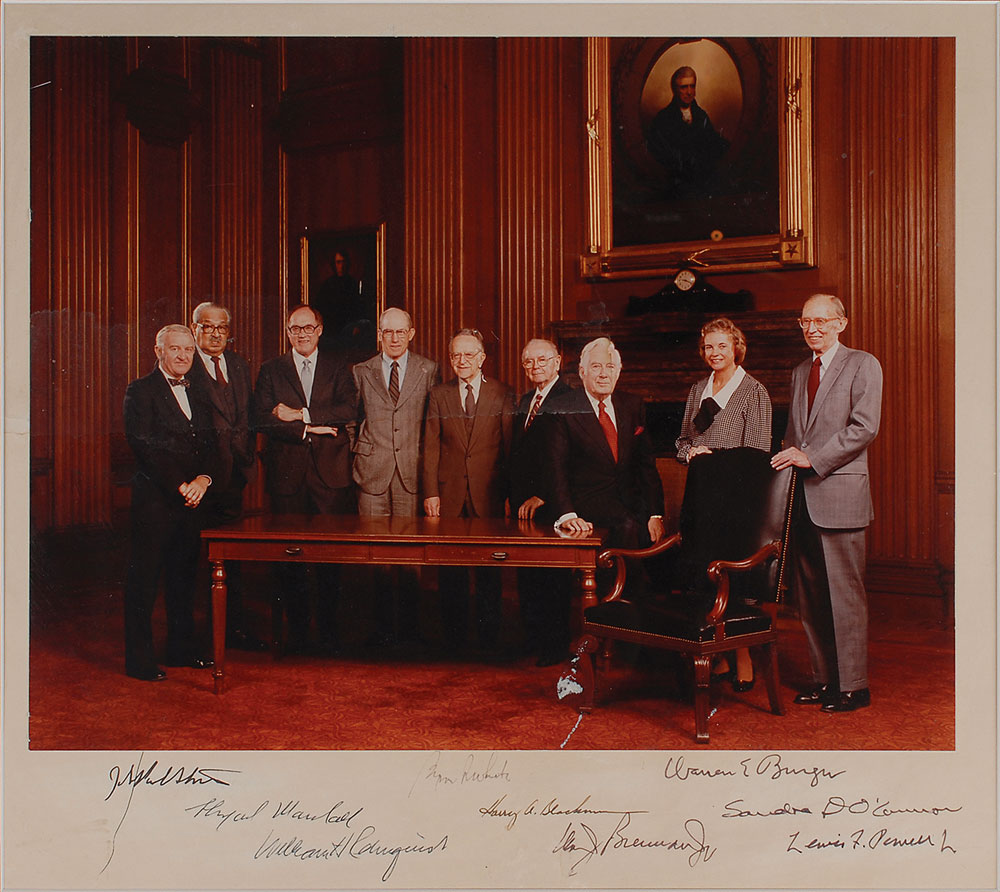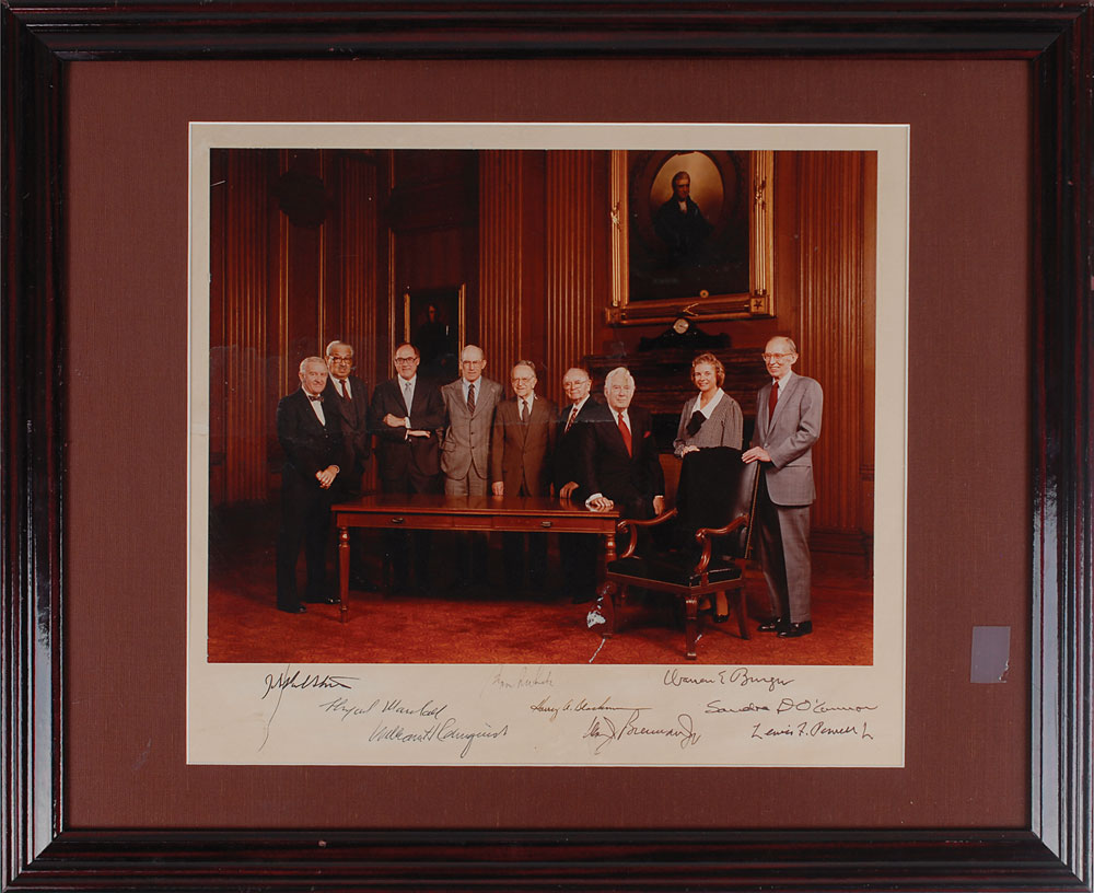 Uncommon color matte-finish 13.5 x 10.5 photo of the Burger Court affixed to a slightly larger mount, signed on the mount in ink by all nine justices: Warren E. Burger, Thurgood Marshall, William J. Brennan, Byron White, Lewis F. Powell, Jr., Harry A. Blackmun, William Rehnquist, Sandra Day O’Connor, and John Paul Stevens. Matted and framed. In very good condition, with a central horizontal crease through the photo, some imperfections to the emulsion, a couple spots of surface loss, and a stray mark to the lower left. Pre-certified PSA/DNA.