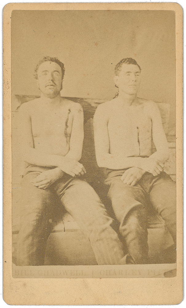 Rare 2.5 x 4 carte-de-visite portrait of the deceased James–Younger Gang members Bill Chadwell and Clell Miller, imprinted on the reverse, “Bill Chadwell, Clell Miller, The Bank Robbers killed at Northfield. Photographed by E. F. Everitt, Mankato, Minn.” In fine condition. During the gang’s robbery attempt at First National Bank of Northfield on September 7, 1876, the two outlaws were shot and killed by responding townspeople, who then propped them up in chairs to take this photograph. Also wounded in the gunfighter were Frank James and Cole Younger. A decidedly unusual piece.