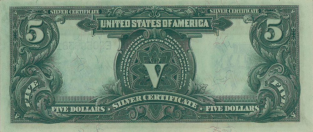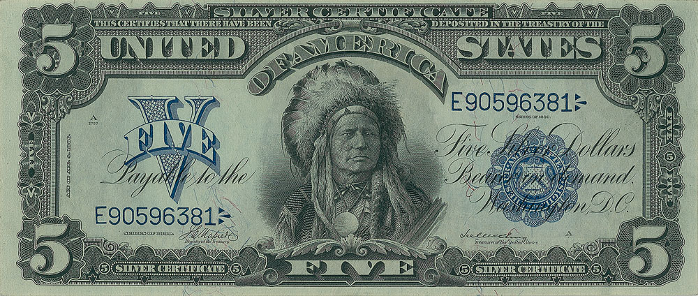 Stunning series 1899 five dollar ‘Indian Chief’ silver certificate, serial number “E90596381,” plate number “A1707/1061.” Encapsulated in a plastic PCGS currency authentication and grading sleeve, evaluating the note as “Choice New, 63PPQ.” This sought-after note is cataloged as number Fr. 275 in Friedberg’s Paper Money of the United States.