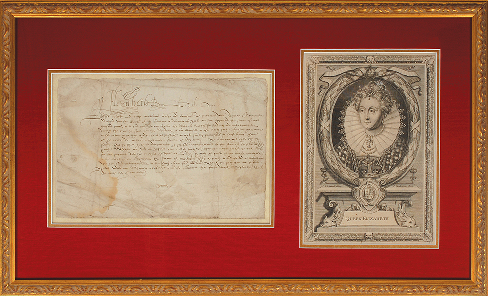 LS signed "Elizabeth I," one page, 12.5 x 8.5, September 1, 1568. Letter to the Count of Winchester, Tresor of England, about payment of 1000 livres to her cousin, the Count of Sussex. Beautifully mounted, double-matted, and framed beside a detailed engraving of the queen to an overall size of 18 x 29. In very good condition, with intersecting folds and overall creasing, scattered soiling, dampstaining to the left side, and slight paper loss to edges; Elizabeth's large, bold signature is largely unaffected. Oversized.