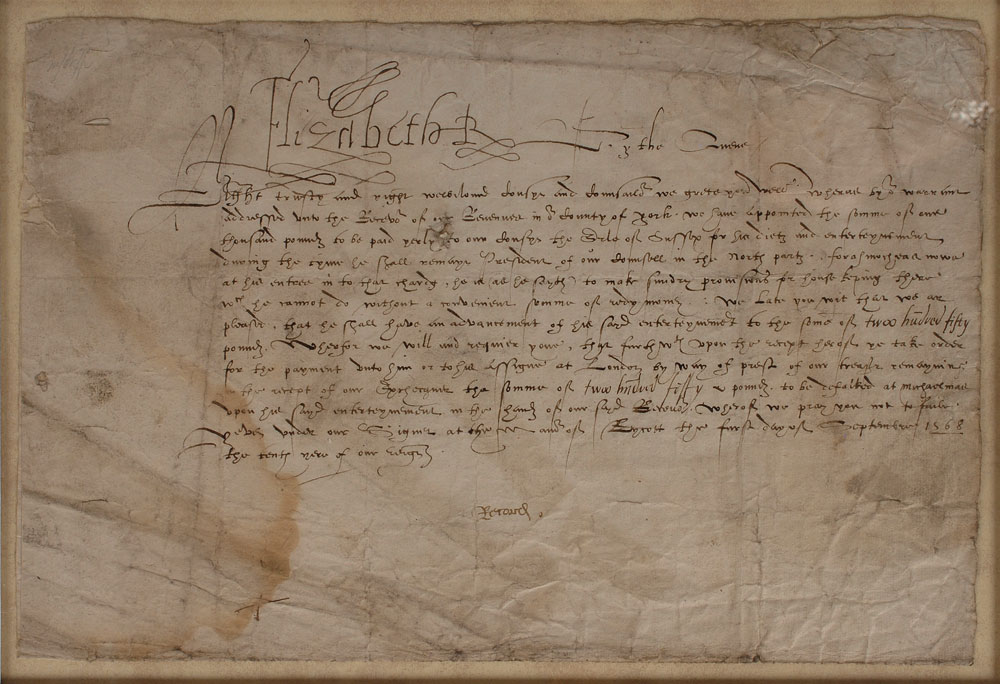 This comes from a time of great significance in Queen Elizabeth's life and legacy, as 1568 was the year she famously imprisoned her cousin, Mary, Queen of Scots. Mary was taken into custody in May and a commission of inquiry began in October, just a month after Elizabeth signed this document. During these proceedings, the Earl of Moray produced the 'casket letters' as evidence that implied her complicity in the murder of her husband, Lord Darnley. She was detained for the next nineteen years before being beheaded after accusations of concocting a plot to assassinate Queen Elizabeth. A rare and truly remarkable document from a crucial moment in European history.