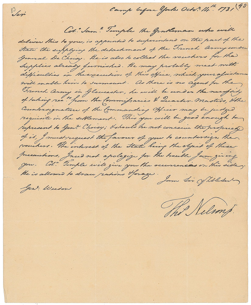 Signer of the Declaration of Independence and member of the Virginia delegation to the Continental Congress (1738–1789). Revolutionary War–dated LS signed “Thos. Nelson Jr.,” one page, 7.5 x 9.25, October 14, 1781. Letter to General George Weedon. In part: “Col. James Temple the gentleman who will deliver this to you, is appointed to superintend on the part of the state the supplying [of] the detachment of the French Army under General De Choisy. He is also to collect the vouchers for the supplies already furnished. He may probably meet with difficulties in the execution of this office, which your assistance will enable him to surmount. As there is no Agent for the French Army in Gloucester, he will be under the necessity of taking receipt from the Commissaries & Quarter Master.” In fine condition.