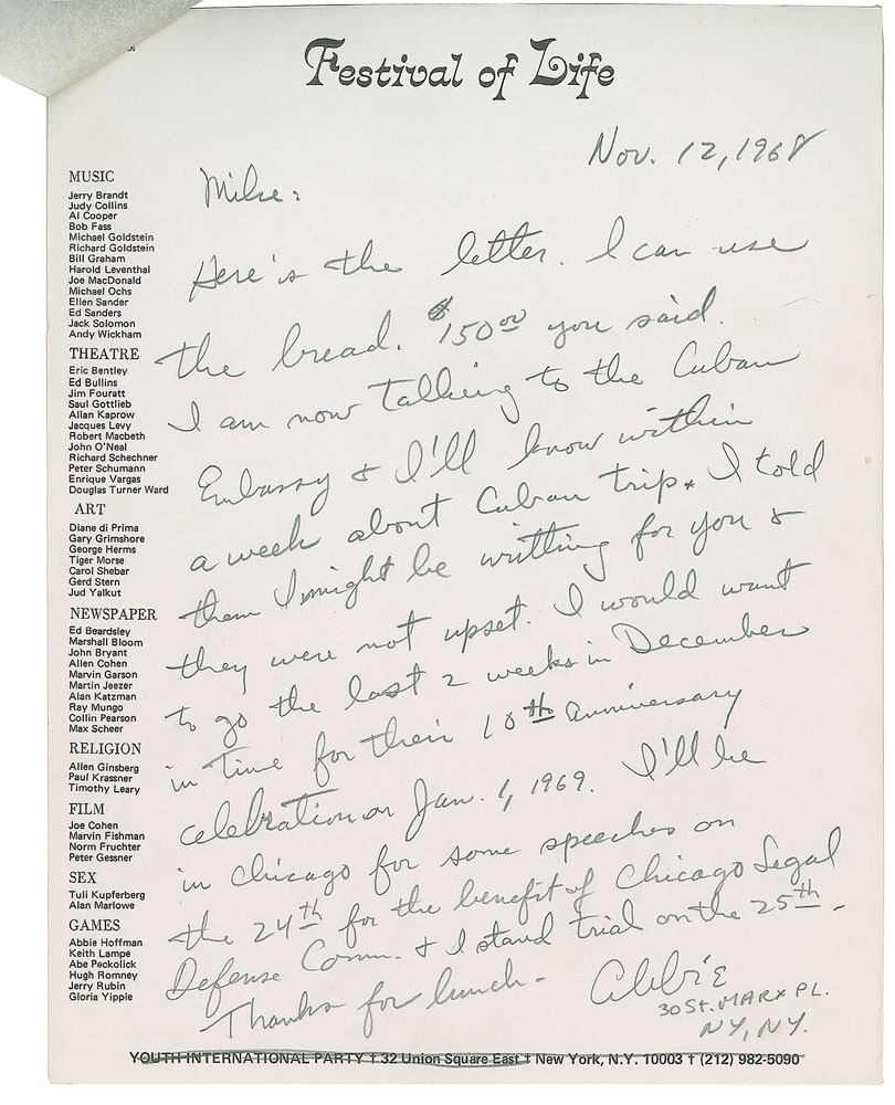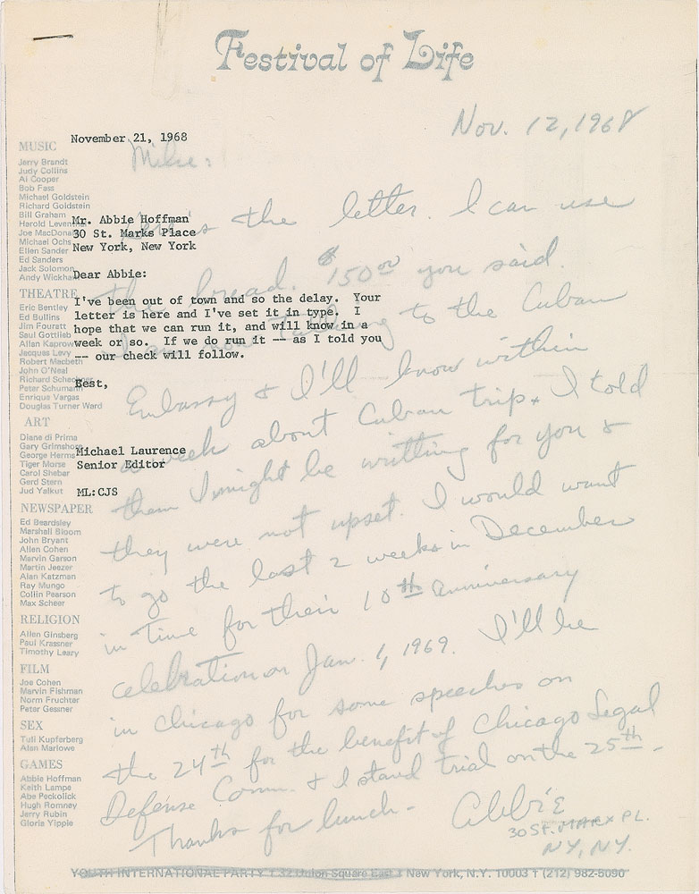 ALS signed “Abbie,” one page, 8.5 x 11, Festival of Life letterhead, November 12, 1968. Letter to Playboy executive Mike Laurence, in full: “Here is the letter. I can use the bread. $150.00 you said I am now talking to the Cuban Embassy & I’ll know within a week about Cuban trip. I told them I might be writing for you & they were not upset. I would want to go the last 2 weeks in December in time for their 10th anniversary celebration on Jan. 1, 1969. I’ll be in Chicago Legal Defense Comm. & I stand trial on the 25th.” Stapled to the letter is a carbon copy response from Laurence stating that Playboy will send him a check if they publish his letter. In fine condition. On September 17, 1968, Hoffman was arrested at Chicago’s O’Hare International Airport after failing to appear in court for an arrest stemming from his involvement in inciting riots at the Democratic National Convention. The court date “on the 25th” resulted in the creation of the infamous Chicago Seven, a counterculture phenomenon in which Hoffman and six others were charged with conspiracy and other offenses related to the DNC riots. An exceptional letter from the notorious YIP leader. Pre-certified PSA/DNA.