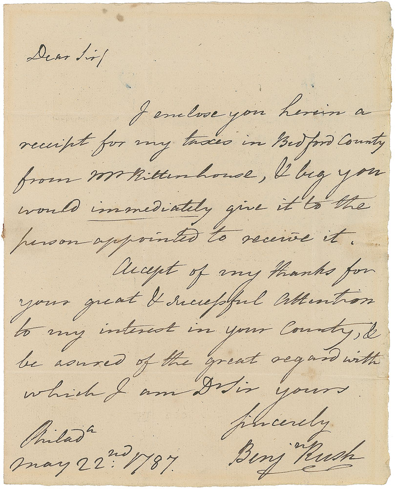 Physician and surgeon general of the Continental Army who signed the Declaration of Independence (1746–1813). ALS signed “Benj. Rush,” one page, 6.5 x 8, May 22, 1787. Letter to George Woods. In part: “I enclose you herein a receipt for my taxes in Bedford County.” Addressed on the reverse of the second integral page in his own hand. In very good to fine condition, with seal-related paper lost to the integral address leaf. Pre-certified PSA/DNA.