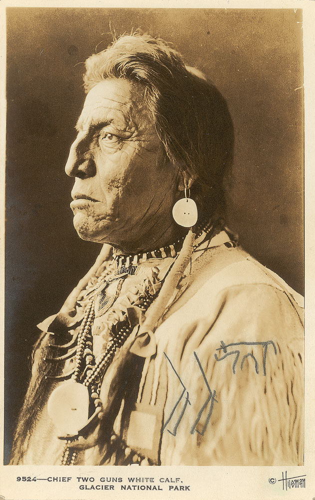 Vintage 3.5 x 5.25 postcard photo of Two Guns White Calf in near-profile, signed in pencil with his three-character pictogram of two rifles and a horned calf. In fine condition. Pre-certified PSA/DNA.