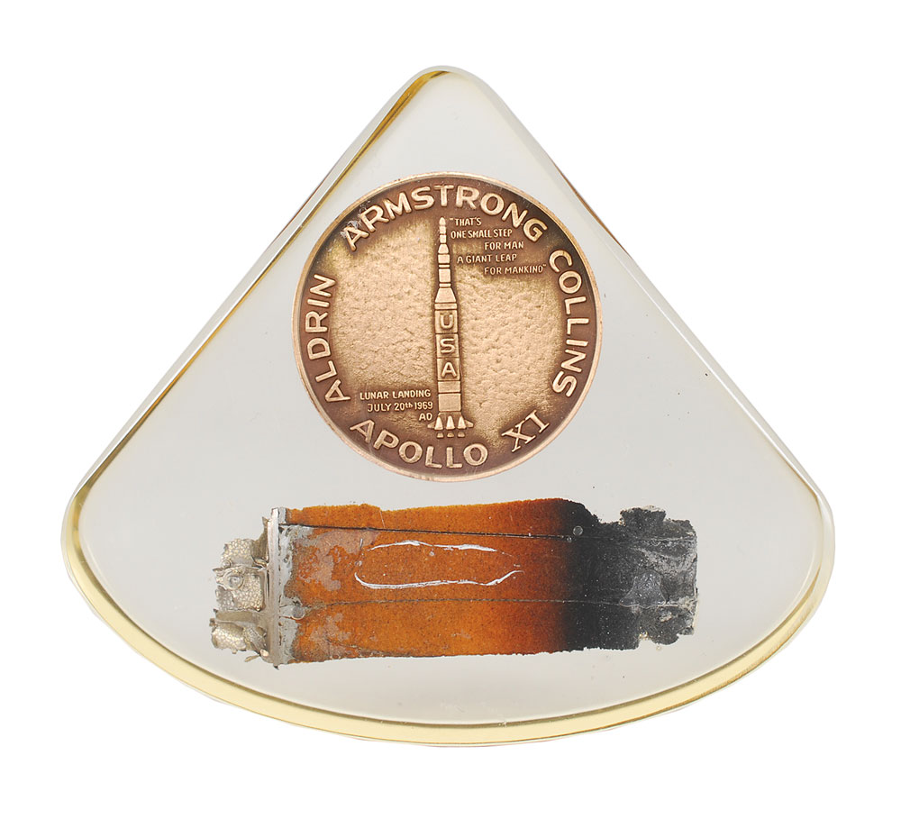 Flown heat shield fragment removed from the Apollo 11 command module Columbia. The fragment measures approximately 2 x .5 and is encased in a capsule-shaped 3.25 x 2.75 x .75 piece of Lucite with an embedded commemorative Apollo 11 coin showing a Saturn V rocket on the front and an astronaut on the lunar surface on the reverse. In fine condition. Consignor notes that the item originates from Chuck Graham, the executive director of public relations for North American Aviation.