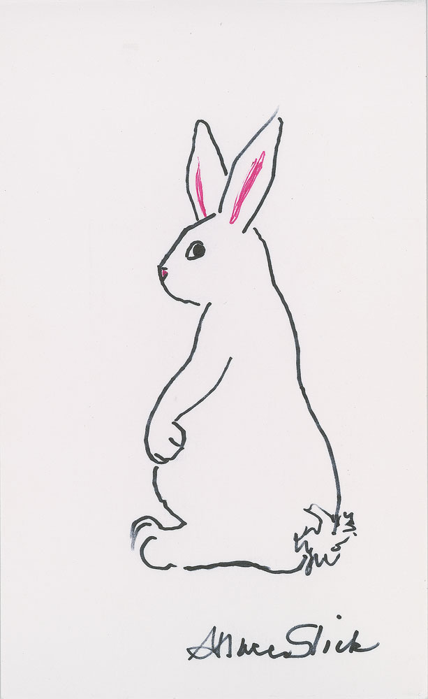 Original signed ink and felt tip sketch of a white rabbit peering over its shoulder, drawn by Slick on a white 5.25 x 8.5 cardstock sheet, signed below in black felt tip. In very fine condition. Pre-certified REAL.
