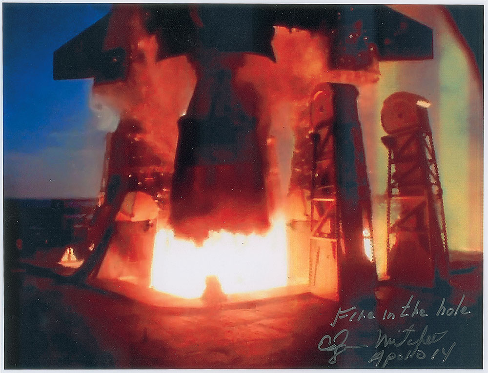 Color glossy 11 x 8.5 laserprint photo of the Apollo 14 launch, signed in silver ink, “Fire in the hole, Edgar Mitchell, Apollo 14.” In fine condition, with a slightly grainy quality to the image. The Leslie Cantwell Collection Pre-certified Zarelli Space Authentication.