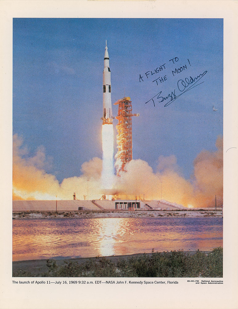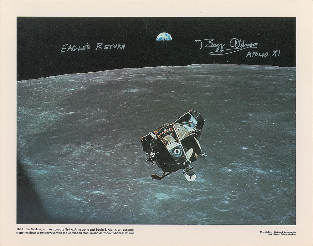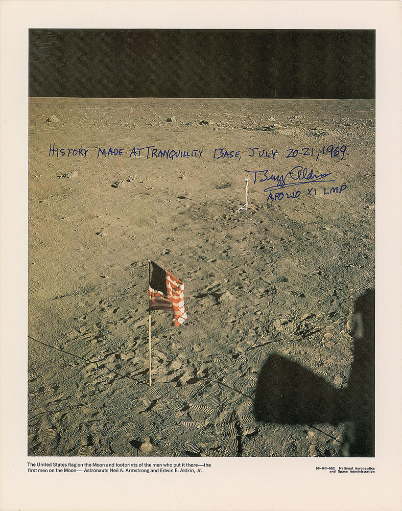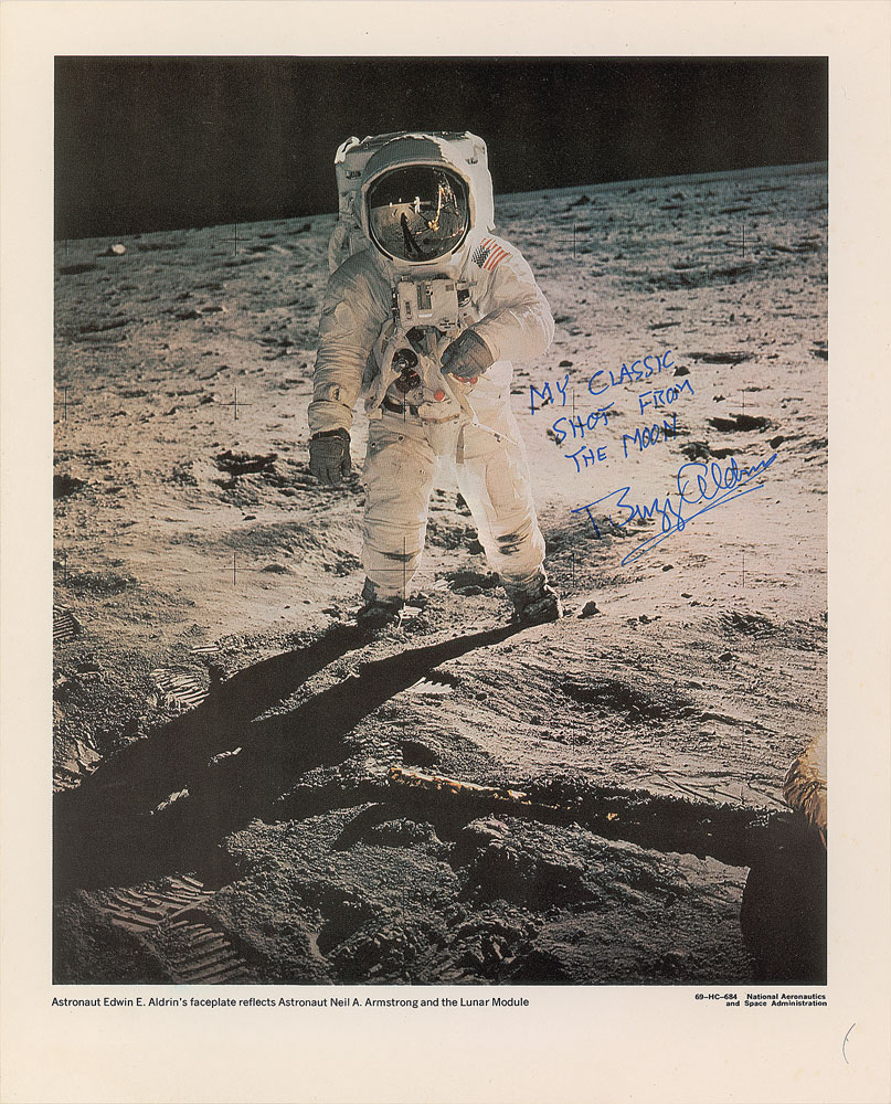Extraordinary collection of eight oversized official NASA lithographs telling the story of man’s first trip to the lunar surface, 11 x 14 and 14 x 11, each signed in ink or felt tip by Aldrin, who adds a short description of the image to all. These inscriptions include: “A Flight to the Moon!”; “USA on the Moon!”; “Science on the Moon”; “Neil’s and My Footprints”; “My Classic Shot from the Moon”; “History Made at Tranquility Base, July 20–21, 1969”; “Eagle’s Return”; and “We Return Safely to Earth.” In overall fine condition. These oversized NASA lithographs are uncommon in general and this set is further enhanced by Aldrin’s additions of several rare inscriptions describing the various steps of his historic mission. The Leslie Cantwell Collection. Pre-certified Zarelli Space Authentication.