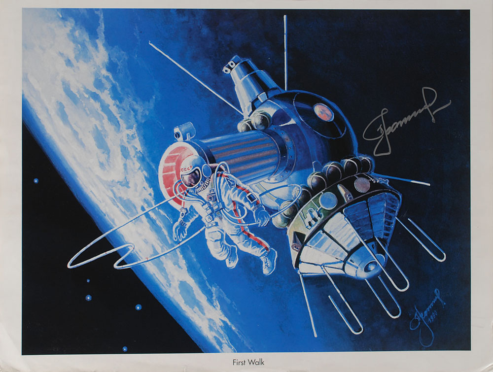 Color 22 x 16.75 lithograph of Alexei Leonov’s 1990 painting entitled ‘First Walk,’ depicting his own historic 12-minute spacewalk during the Voskhod 2 mission, signed in silver ink by Leonov. In very good to fine condition, with some creasing, trimmed edges, and a few small tears. The Leslie Cantwell Collection. Pre-certified Zarelli Space Authentication.