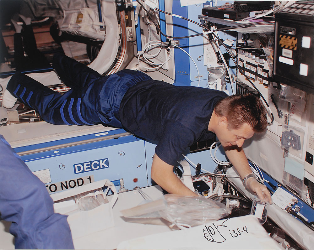 Color satin-finish 20 x 16 photo of Expedition 4 Commander Yuri Onufrienko floating horizontally inside the spacecraft, signed in black felt tip by Onufrienko, who has added the mission, “iss–4.” In fine condition. The Leslie Cantwell Collection. Pre-certified Zarelli Space Authentication.