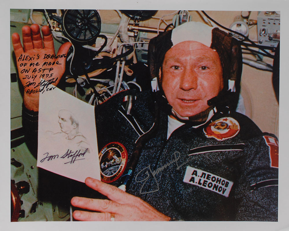 Color satin-finish 20 x 16 photo of Alexei Leonov displaying his sketch of Apollo commander Tom Stafford during the ASTP flight, signed in black felt tip, “Alexi’s drawing of me made on ASTP, July 1975, Tom Stafford, Apollo, Cdr,” and in silver ink, “Leonov.” Stafford has also added his signature to the bottom of the sketch. In fine condition, with slight haloing to the Stafford sketch signature, and a slightly grainy quality to the image. The Leslie Cantwell Collection. Pre-certified Zarelli Space Authentication.