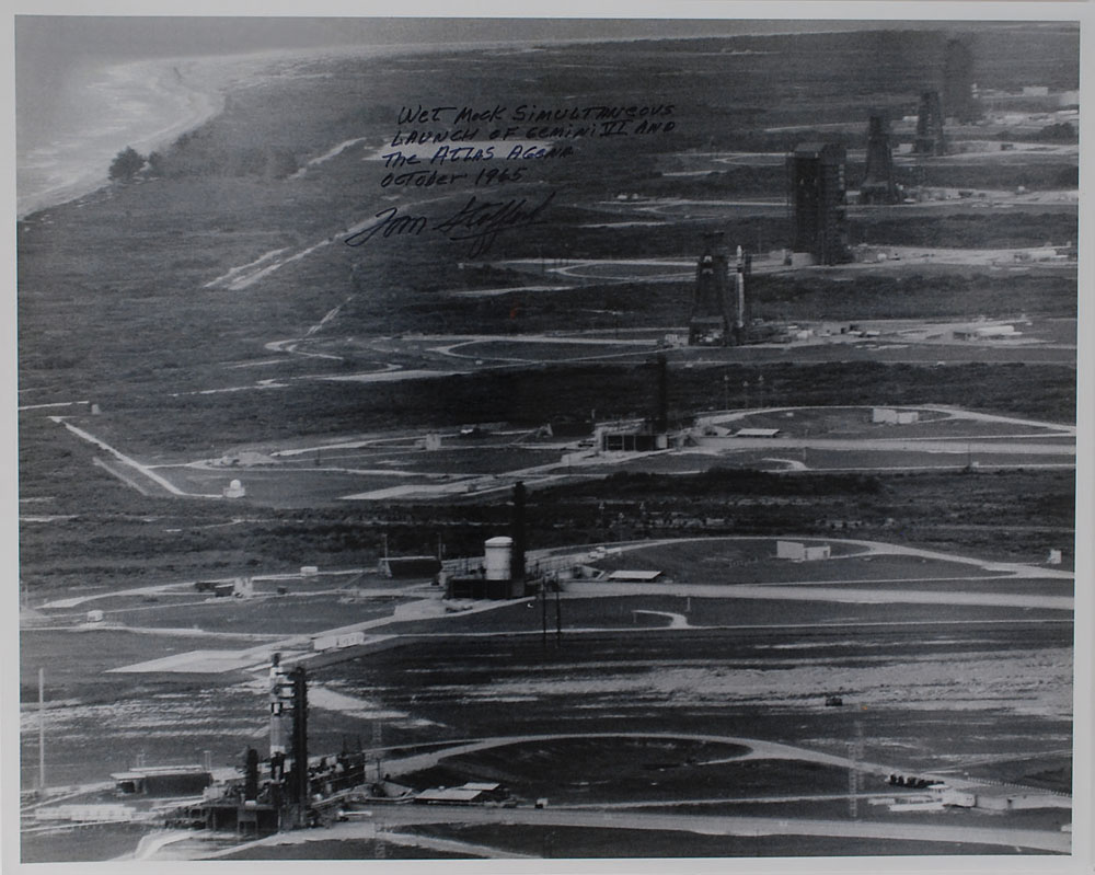 Glossy 20 x 16 photo of the numerous launch pads lining the coast of the Cape Canaveral Air Force Station, signed in black felt tip, “Wet mock simultaneous launch of Gemini VI and the Atlas Agena, October 1965, Tom Stafford.” In fine condition, with a slightly grainy quality to the image. The Leslie Cantwell Collection. Pre-certified Zarelli Space Authentication.