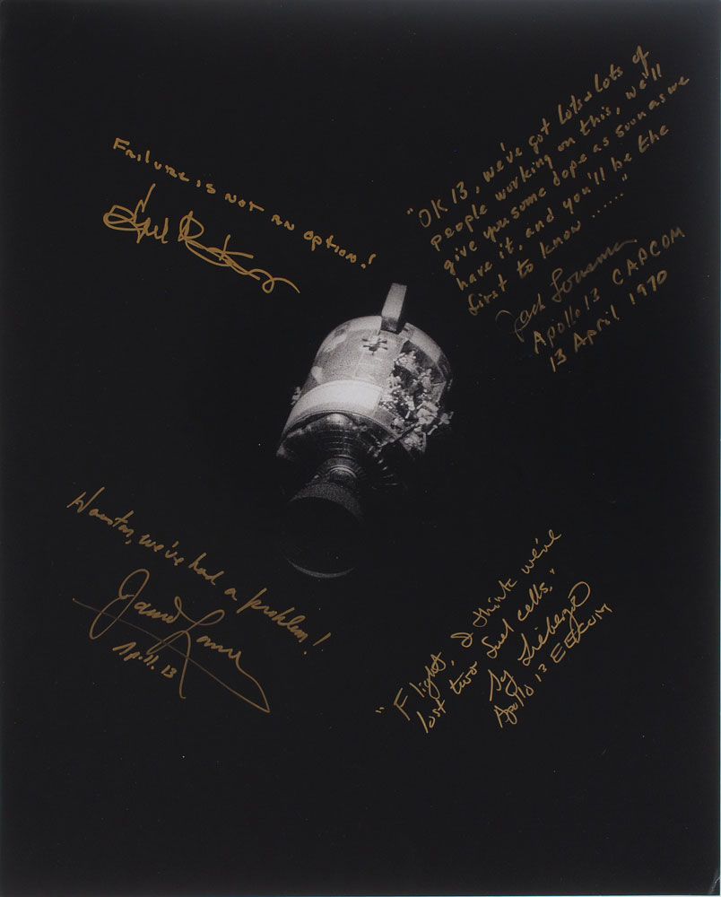 Satin-finish 20 x 16 photo of the damaged Apollo 13 command module floating in space, signed in gold ink, “Houston, we’ve had a problem! James Lovell, Apollo 13,” “Failure is not an option, Gene Kranz,” “‘Flight, I think we’ve lost two fuel cells.’ Sy Liebergot, Apollo 13 EECOM,” and “‘OK 13, we’ve got lots & lots of people working on this, we’ll give you some dope as soon as we have it, and you’ll be the first to know…’ Jack Lousma, Apollo 13 CAPCOM, 13 April 1970.” Accompanied by a 10 x 8 satin-finish photograph of fellow flight director Gerry Griffin signed in black felt tip, “Gerry Griffin, ‘Gold Flight’ Apollo 13.” In fine condition. A uniquely appealing photo recalling NASA’s most courageous moment. The Leslie Cantwell Collection. Pre-certified Zarelli Space Authentication.