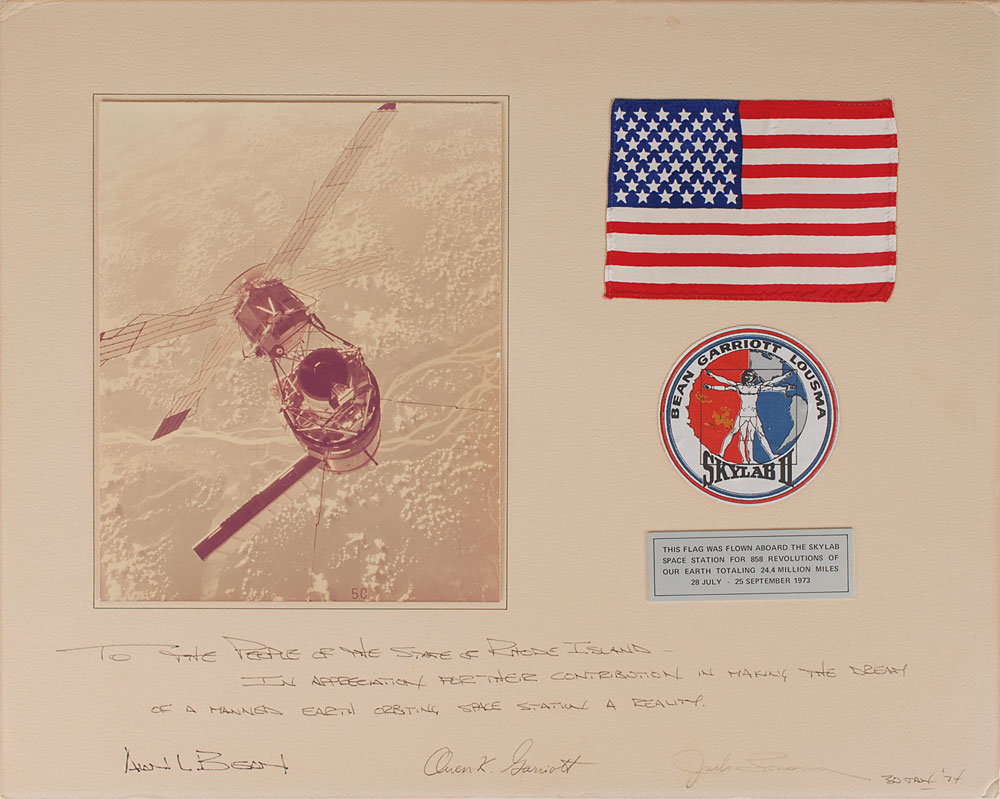 Flown American flag carried aboard the Apollo CSM-117 to the Skylab space station, 5.75 x 4, affixed to a 20 x 16 presentation mount bearing an affixed photo of the space station, a Skylab II beta patch, and a small plaque, reading, in full: “This flag was flown aboard the Skylab Space Station for 858 revolutions of our Earth totaling 24.4 million miles, 28 July—25 September 1973.” Signed and inscribed on the mount in black ink, “To the people of the state of Rhode Island—In appreciation for their contribution in making the dream of a manned Earth orbiting space station a reality, Alan L. Bean, 30 Jan. ‘74,” “Owen K. Garriott,” and “Jack Lousma.” In fine condition. From the collection of aerospace memorabilia specialist Ken Havekotte. Pre-certified Zarelli Space Authentication.