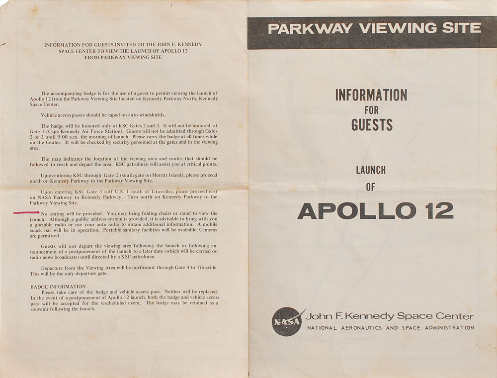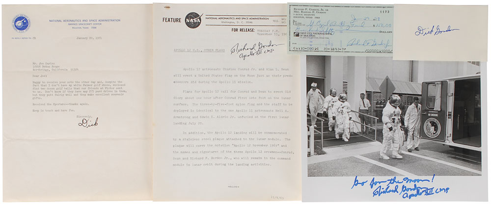 Five items: a felt tip signature, “Dick Gordon,” on an off-white 5 x 3 card; a personal check, filled out and signed by Gordon, “Richard F. Gordon, Jr.,” dated January 29, 1978; a TLS signed “Dick,” one page, NASA letterhead, dated January 20, 1971, in part: “Happy to receive your note the other day and, despite the fact that I don’t have my white Palmer golf shoes, enclosed find two dozen golf balls that our friends at Victor sent to find us”; a NASA press release, four pages, dated November 11, 1969, headed “Apollo 12 U. S., Other Flags,” and signed on the first page in black ink, “Richard Gordon, Apollo XII CMP”; and an official glossy 10 x 8 photo of the Apollo 12 crew departing for Launch Complex 39’s Pad A, signed in the lower border in blue felt tip, “Go for the moon! Richard Gordon, Apollo XII CMP.” In overall fine condition. Accompanied by an unsigned NASA-printed guest parking pamphlet for the launch of Apollo 12. From the collection of aerospace memorabilia specialist Ken Havekotte. Pre-certified Zarelli Space Authentication.