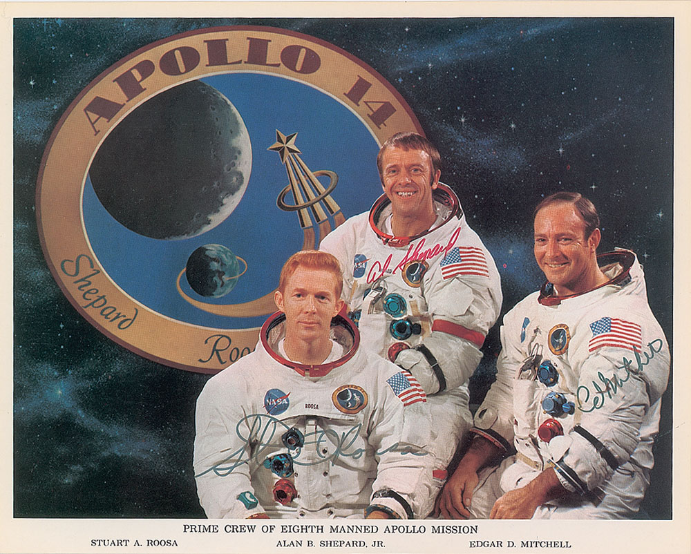 Official color 10 x 8 NASA lithograph of the Apollo 14 crew posing in their white spacesuits in front of their mission insignia, signed in red felt tip by Alan Shepard, and in black felt tip by Ed Mitchell and Stu Roosa. In fine condition. A desirable, uninscribed example of the full crew. From the collection of aerospace memorabilia specialist Ken Havekotte. Pre-certified Zarelli Space Authentication.