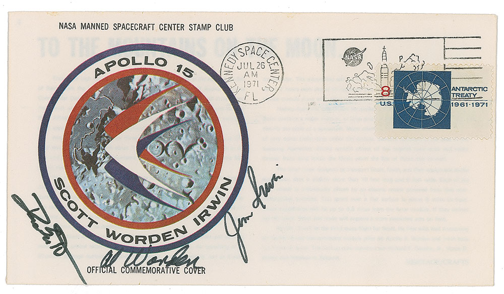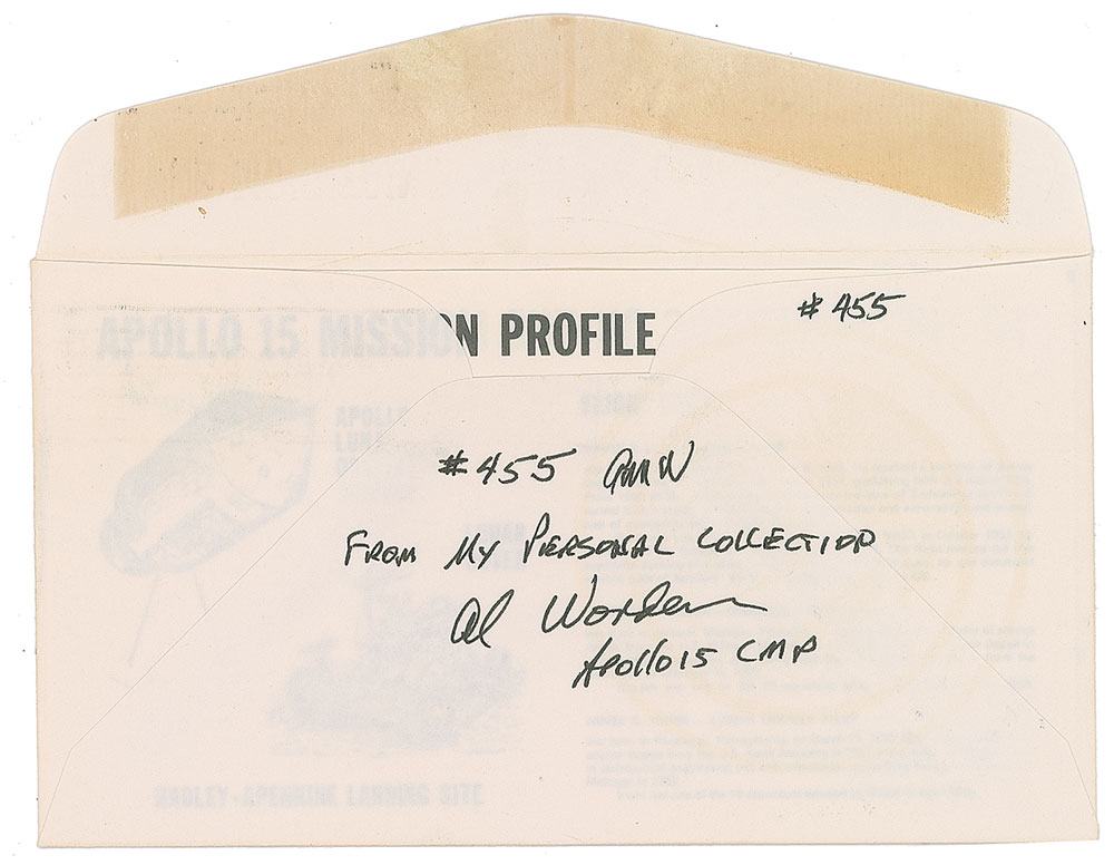 Apollo 15 ‘Type 1’ insurance cover, 6.5 x 3.5, with a cachet of the Apollo 15 mission insignia, and bearing a July 26, 1971, Kennedy Space Center postmark, signed in black felt tip by Dave Scott, Al Worden, and Jim Irwin. Also signed inside the flap, “From my personal collection, Al Worden, Apollo 15 CMP,” and initialed above “#455 AMW.” In fine condition. Accompanied by a signed letter of authenticity from Worden which states, “I hereby certify that the commemorative postal cover number 455…was an Apollo 15 insurance cover. It has been in my possession since the flight in 1971.” From the collection of aerospace memorabilia specialist Ken Havekotte. Pre-certified Zarelli Space Authentication.