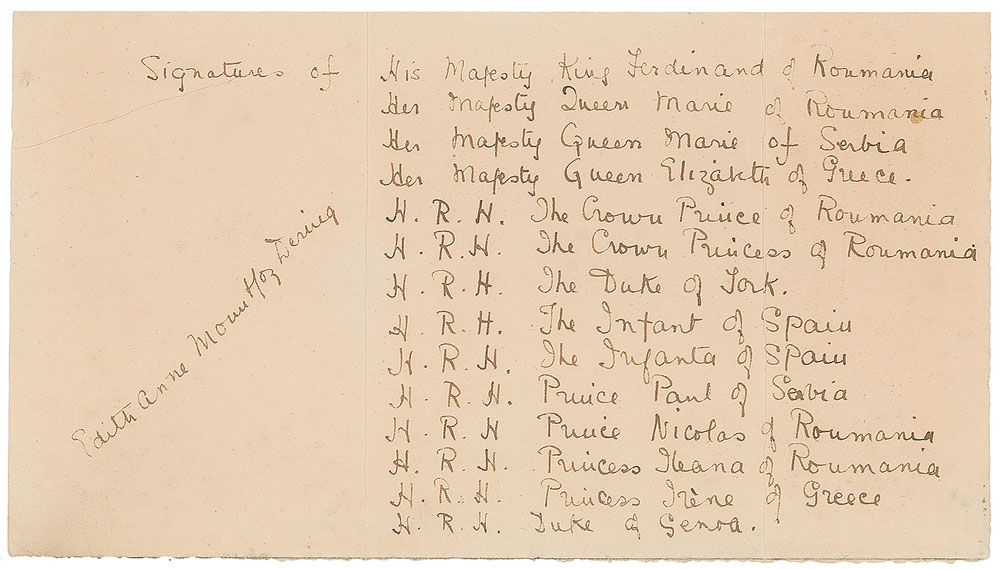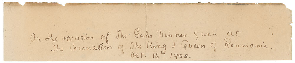 Menu for the coronation dinner of the king and queen of Romania held on October 16, 1922, one page, 4.25 x 6.75, signed in ink by fourteen members of royalty from around the world, including: the future King George VI, signed “Albert”; Edith Anne Mountjoy Dering; King Ferdinand of Romania; Queen Marie of Romania; Queen Elisabeth of Greece; Queen Marie of Yugoslavia; Thomas of Savoy, Duke of Genoa; Alfonso, Infante of Spain; Beatrice of Saxe-Coburg; Prince Paul of Yugoslavia; Prince Nicolas of Romania; Princess Ileana of Romania; Crown Prince Carol of Romania (who would become King Carol II in 1930, and a Knight of the Garter in 1938); and Crown Princess Helen of Romania. Includes a list of the signers penned by Lady Edith Mountjoy Dering. In fine condition. Pre-certified PSA/DNA.