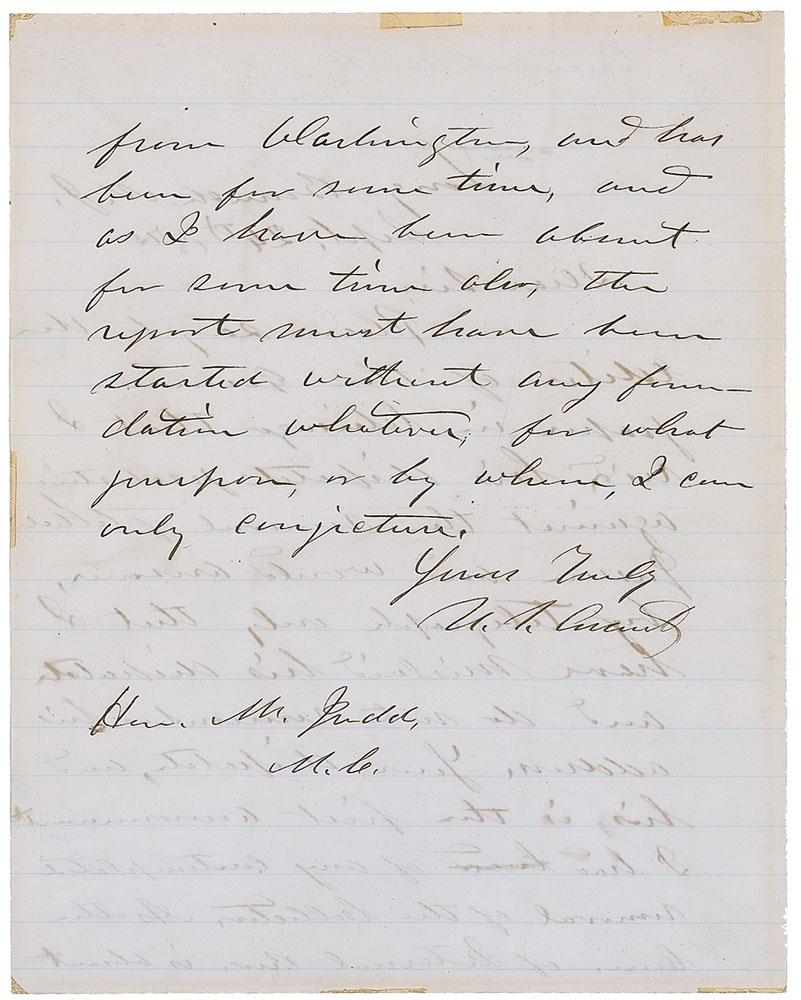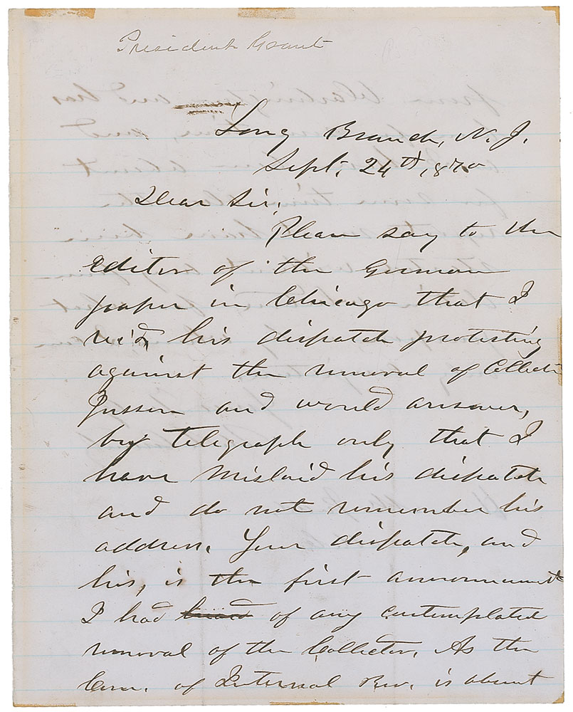 ALS as president, one page, lightly-lined both sides, 7.75 x 9.75, September 24, 1870. Letter sent from Long Branch, New Jersey, to Illinois Congressman Norman Judd. In full: “Please say to the editor of the German paper in Chicago that I rec'd his dispatch protesting against the removal of Collector Gusser and would answer by telegraph only that I have mislaid his dispatch and do not remember his address. Your dispatch, and his, is the first announcement I had of any contemplated removal of the Collector. As the Comm. of Internal Rev. is absent from Washington, and has been for some time, and as I have been absent for some time also, the report must have been started without any foundation whatever, for what purpose or by whom, I can only conjecture.” In fine condition, with tape remnants to top and bottom edges, and show-through from writing to opposing sides. Pre-certified PSA/DNA.