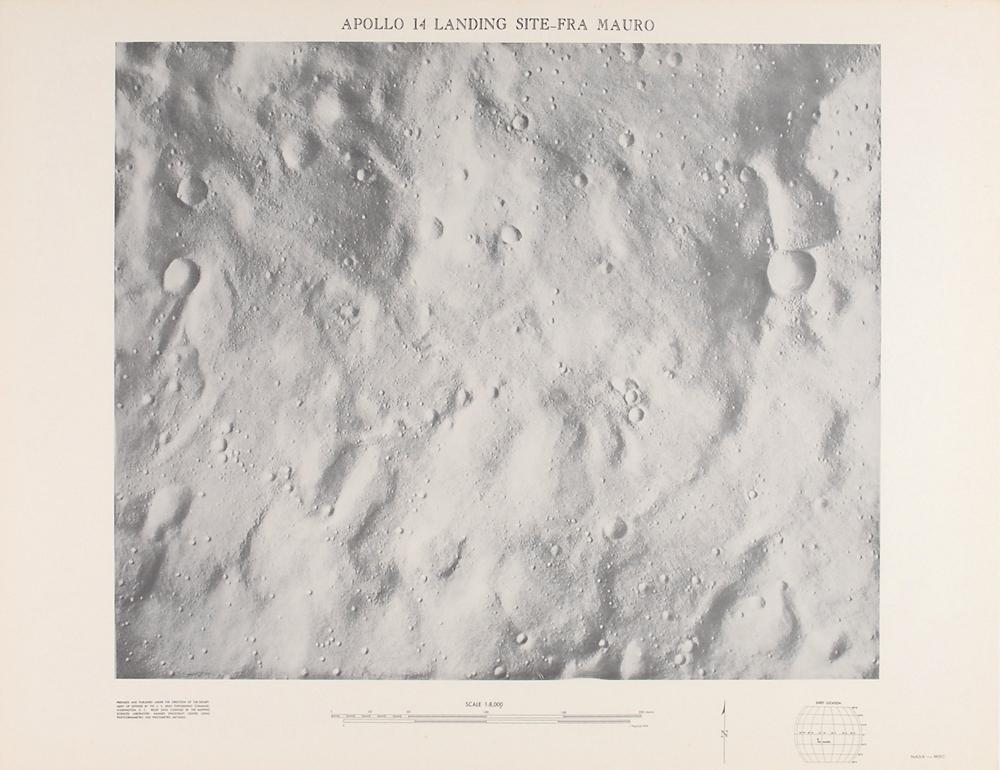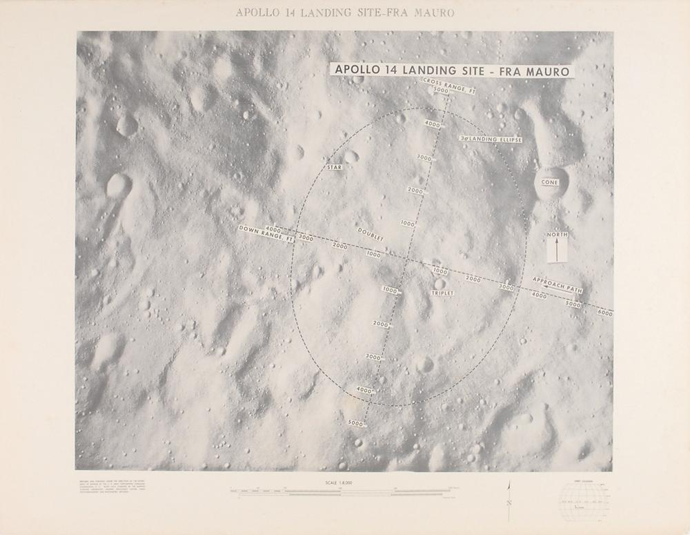 Collection of three original charts prepared for NASA by the Department of Defense, all measuring 22″ x 17″, with each showing scale representations of the Apollo 14 landing site at Fra Mauro. Rolled and in fine condition, with a bit of scattered light foxing and a couple of corner creases.