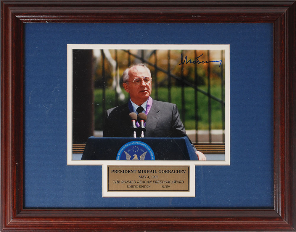 Limited edition color glossy 9.5 x 6.75 photo of Gorbachev following his acceptance of the first ever Ronald Reagan Freedom Award at the Reagan Library on May 4, 1992, numbered 82/250, signed in the upper right corner in blue felt tip. Framed with an engraved nameplate. In fine condition. Pre-certified PSA/DNA.