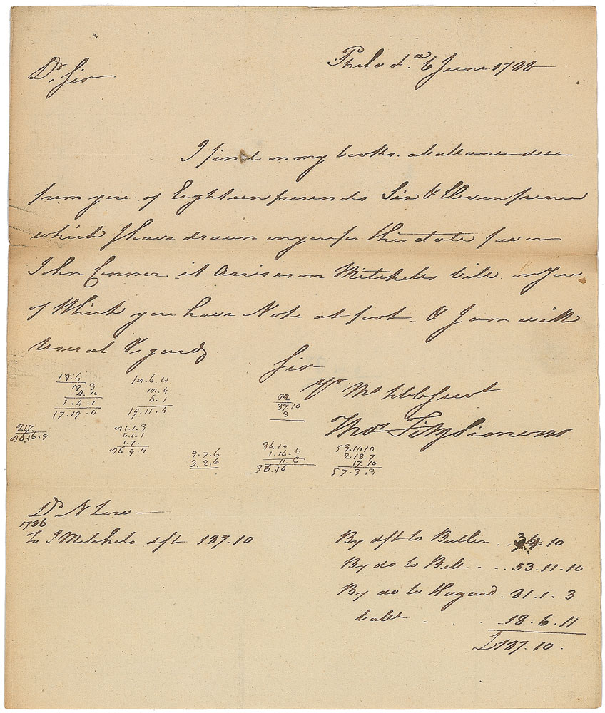 ALS signed “Thos. Fitzsimons,” one page, 7.75 x 9, June 6, 1788. Letter to Nicholas Low of New York, acknowledging a debt, in part: “I find in my books a balance due from you of eighteen pounds six and eleven pence which I have drawn myself this date.” Fitzsimons accounts the debt with numerous calculations below. Addressed on the reverse of the second integral page in Fitzsimon’s own hand. In very good to fine condition, with seal-related paper loss to reverse of second integral page. Pre-certified PSA/DNA.