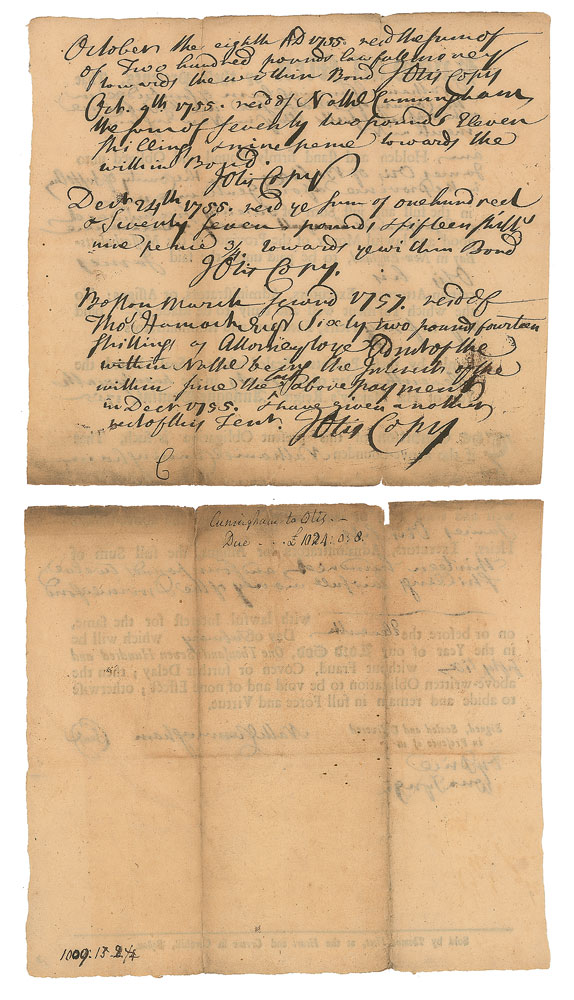 American statesman and lawyer (1725–1783) generally known as the originator of the phrase ‘No taxation without representation.’ Partly-printed ADS signed five times throughout the text, one page both sides, 7 x 13, August 11, 1755. Financial agreement filled out almost entirely in Otis’s hand, including a lengthy autograph statement on the reverse. In part: “Know all men by these presents, That I Nathaniel Cunningham…am Holden and stand firmly Bound and Obliged unto James Otis of Boston in the County of Suffolk…in the full and just Sum of Twenty six hundred & eight pounds…to be paid unto the said James Otis.” On the reverse Otis details several of the payments, signing “J. Otis” three times. In very good condition, with a complete separation to the central horizontal fold. Pre-certified PSA/DNA.