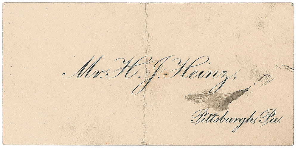 American businessman (1844–1919) whose ‘57 Varieties’ became the nucleus of one of the largest food-processing concerns in the world. TLS signed “H. J. Heinz,” one page, 5.75 x 9, personal letterhead, December 29, 1902. Letter to Miss Frances Pierpont Siviter, in part: “I do not know how you could have selected a nicer Christmas remembrance than the one you sent me. As you have beautifully said ‘it carries a little bit of the summer into the winter,’ for through it one is carried back in thought and memory to the forest and to mother nature. Your mamma’s poem on the sculptor is a tender and beautiful one.” Includes a copy of the referenced poem, and Heinz’s unsigned personal 3.25 x 1.5 calling card. In very good condition, with show-through from a mounting remnant, and a heavy central vertical crease to calling card. Pre-certified PSA/DNA.
