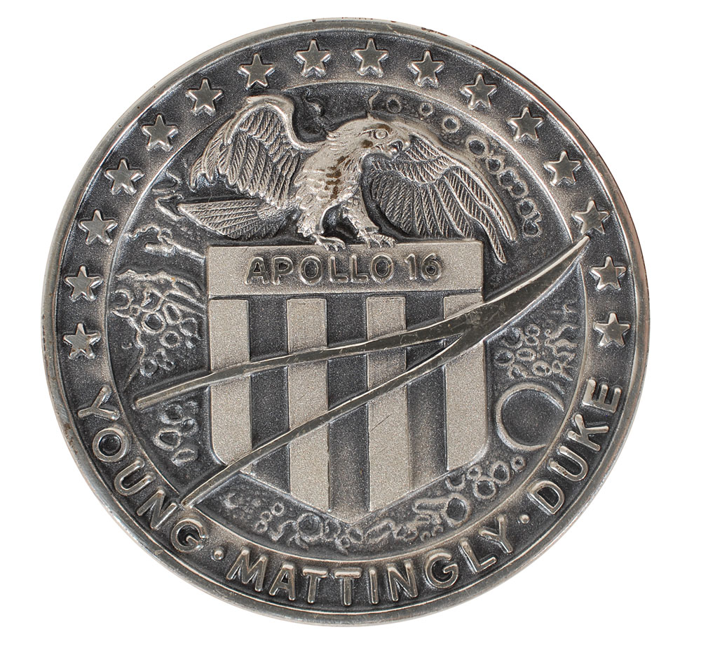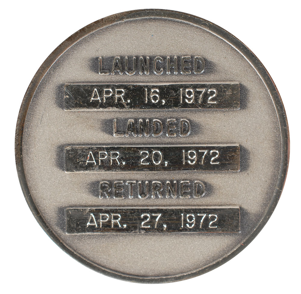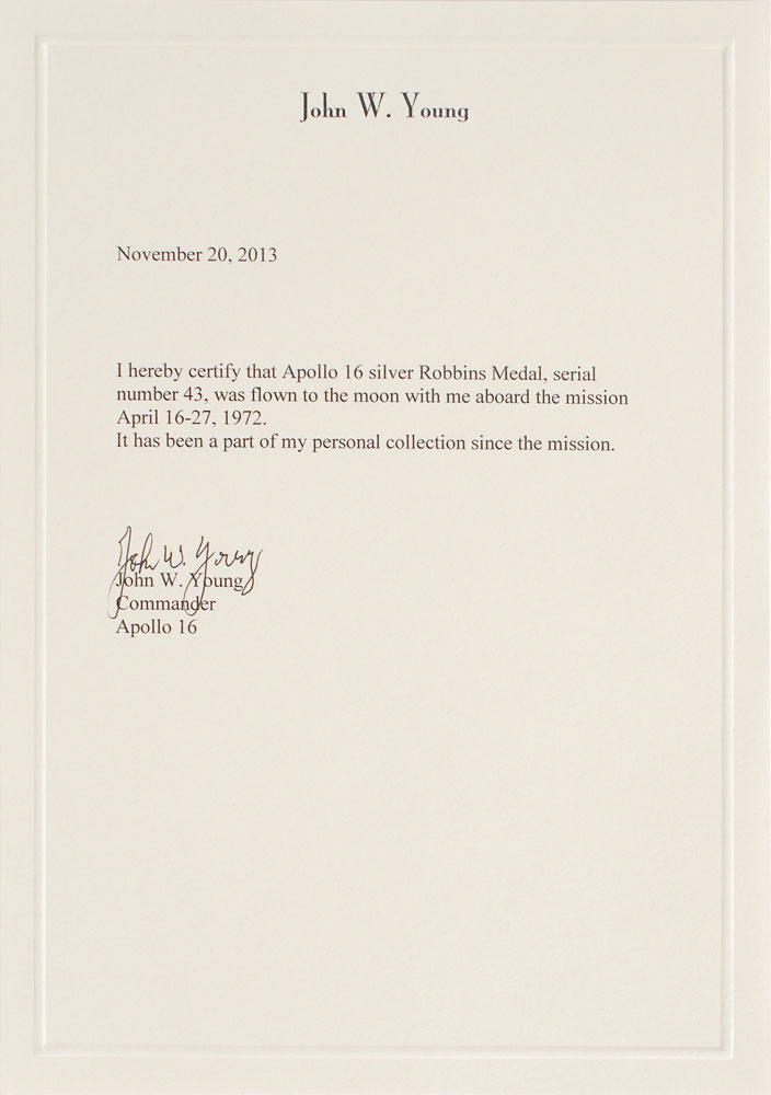 Flown sterling silver Apollo 16 Robbins medal, approximately 1.5? in diameter, with a raised design of the Apollo 16 mission insignia on the face and engraved on the reverse with the launch date of April 16, 1972, moon landing date of April 20, 1972, and return date of April 27, 1972. The medal is serial numbered “43” on the edge. Condition is mint state. Accompanied by a signed letter of provenance from the mission commander John Young, in full: “I hereby certify that Apollo 16 silver Robbins Medal, serial number 43, was flown to the moon with me aboard Apollo 16 April 16–27, 1972, and has been a part of my personal collection since the mission.” This is the second scarcest medallion in the Robbins Series, with just 98 that were flown. In the hierarchy of desirability, a flown Robbins Medallion from a member of the crew who flew it, is most desirable—especially one in such beautiful condition.