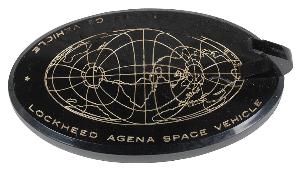Early model of a Lockheed Agena-B upper stage space launch vehicle, measuring 10.75″ long, with original 9.25 x 5.25 plastic base. In fine condition, with soiling and some lettering missing to base.