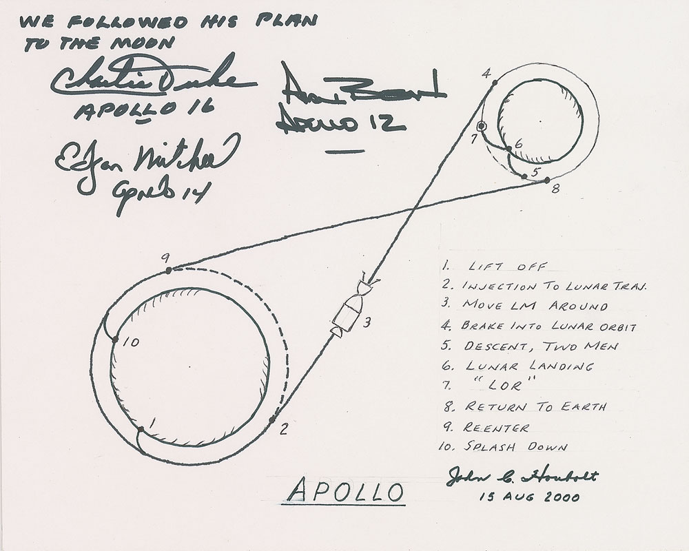 Original felt tip sketch of a lunar orbit rendezvous diagram by aerospace engineer John C. Houbolt on a white 10 x 8 card, signed in black felt tip, “We followed his plan to the moon. Charlie Duke, Apollo 16,” “Alan Bean, Apollo 12,” and “Edgar Mitchell, Apollo 14.” In fine condition. A decidedly unusual format signed by three moonwalkers. Pre-certified Zarelli Space Authentication.