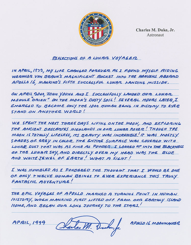 Lengthy souvenir autograph manuscript signed “Charles M. Duke, Jr.,” one page, 8.5 x 11, April 1999, entitled “Reflections of a Lunar Voyager.” In part: “In April, 1972, my life changed forever as I found myself riding Wernher Von Braun’s magnificent rocket into the heavens aboard Apollo 16, mankind’s fifth successful lunar landing mission. On April 20th, John Young and I landed our lunar module 'Orion' on the moon's dusty soil! Several hours later, I emerged to become only the 10th human being in history to ever stand on another world!…The epic voyages of Apollo marked a turning point in human history, when mankind first lifted off from our earthly island home, and began our long journey to the stars!” In fine condition. Pre-certified Zarelli Space Authentication.