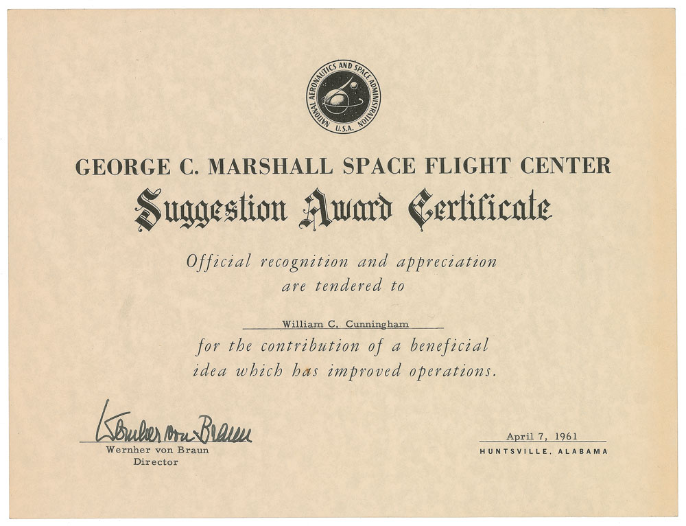 Attractive DS, signed “Wernher von Braun,” one page, 10.5 x 8, April 7, 1961. George C. Marshall Space Flight Center ‘Suggestion Award Certificate’ issued to William C. Cunningham “for the contribution of a beneficial idea which has improved operations.” Boldly signed in the lower left by von Braun. In fine condition. Pre-certified Zarelli Space Authentication.