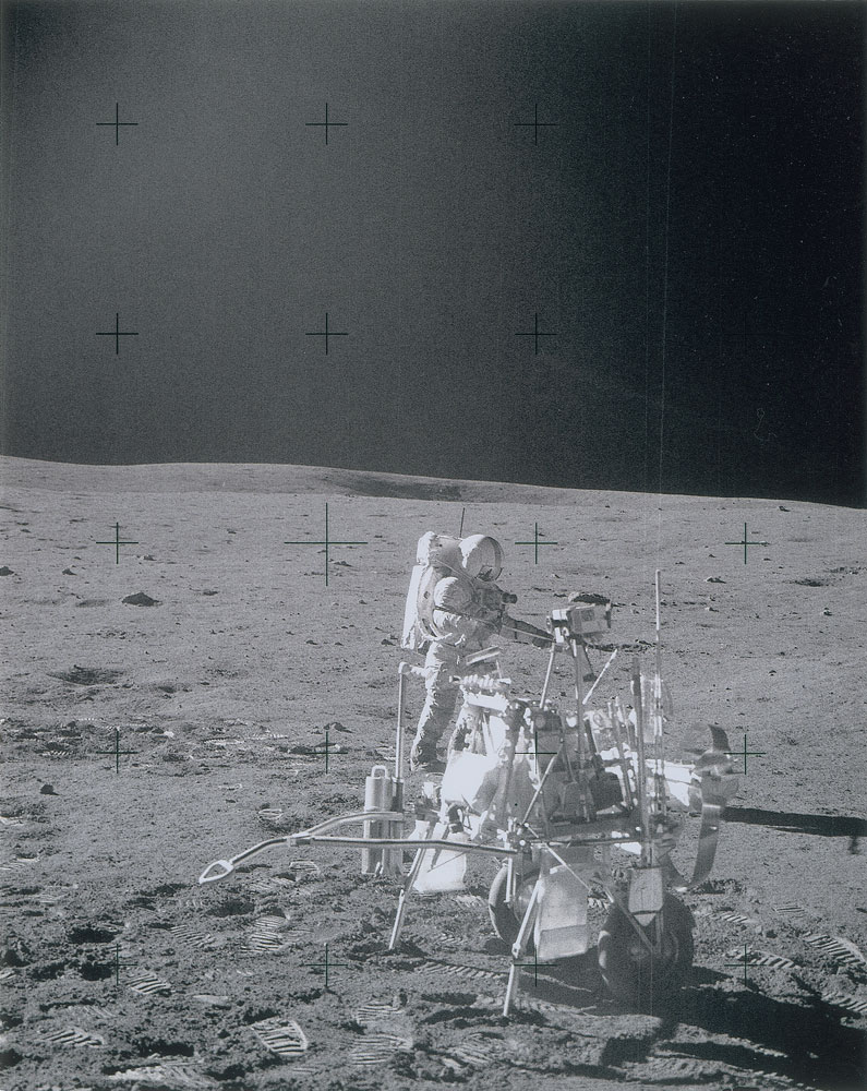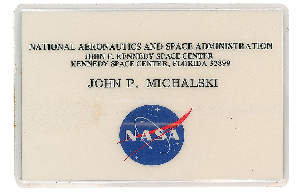 Flown 1 x .25 section of lunar surface safety line carried to the surface of the moon during Apollo 14, presented to a NASA employee following the mission. The swatch is laminated to a 3.25 x 2.75 presentation card for John P. Michalski, reading: “Presented in appreciation of your role in Apollo 14’s success. This small portion of the lunar surface safety line was carried by the astronauts on the moon’s surface February 5–6, 1971.” In fine condition. Accompanied by a satin-finish 8 x 10 photo of Shepard on the lunar surface, showing the equipment cart he used to store the safety line.
