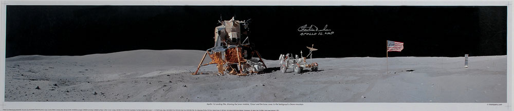 Color satin-finish 40.5 x 10 panoramic photo of the Apollo 16 landing site, showing the lunar module Orion and the lunar rover with Mount Stone in the background, signed in silver ink, “Charlie Duke, Apollo 16 LMP.” In fine condition. Pre-certified Zarelli Space Authentication.