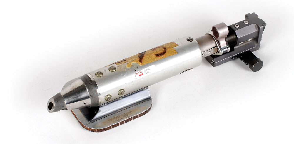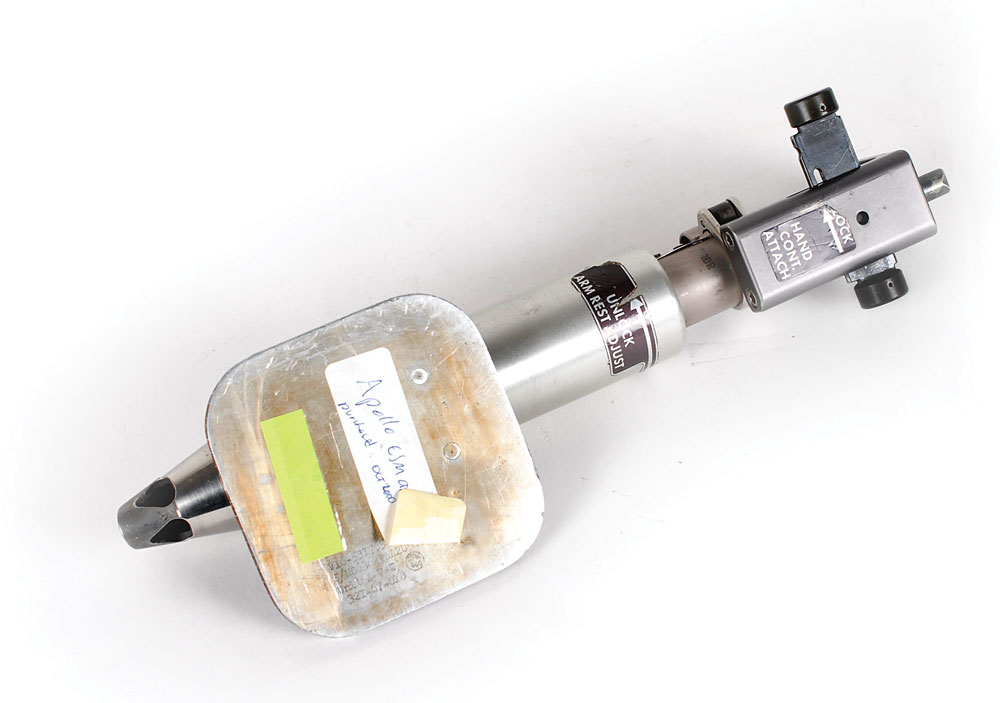 Early Apollo Command Module (Block I) armrest attachment, measuring approximately 13 x 4, with locking and unlocking hand control attachment and armrest adjustment. Label on metal armrest pad reads, “VI6–53I765, S/N0. 6362PAA2850, Unit A. V. T., 32I–67–0I0, SNM 460,” with underside reading, “V36–531770 Assem., 6–Dec–67, ANA 657.” Bottom portion of extension tubing bears an affixed printed label, “993 2SP00, 312,” and toned tape remnants with a felt tip notation, “#75.” The Apollo Command Module Block I armrest mounted to the crew couch and provided an attachment point for the translation and rotational controllers. In very good condition, with aforementioned tape remnants. An intriguing piece of hardware from the Apollo Block I capsule, predecessor parts which remain far less common the Block II examples which followed.