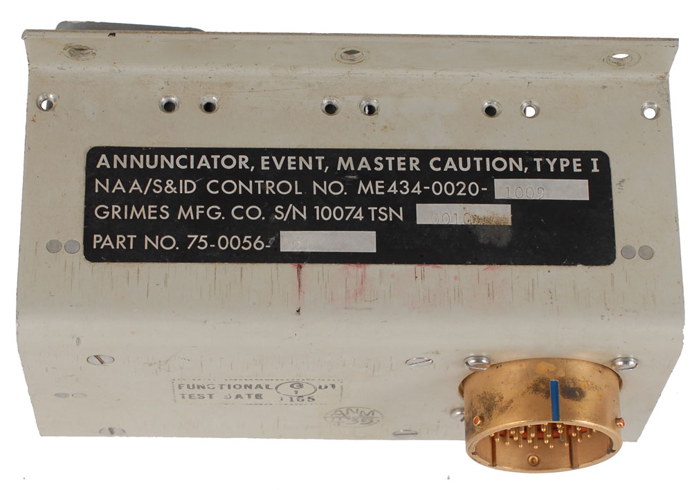 Apollo CM Block I Caution and Warning Indicator Panel, measuring approximately 5.25 x 3.5 x 25, with a label on the top reading, “Annunciator, Event, Master Caution, Type I, NAA/S&ID Control No. ME434-0020-1009, Grimes Matted and framedg. Co. S/N 10074 TSN 0010, Part No. 75-0056-21.” Some of the warning indicators read: “IMU Fail,” “G&N Error,” “Gbml Lock,” “S/M RCS B,” “AGC Pwr Fail,” “S/M RCS D,” and “O2 Press.” In very good condition, with some indicators missing. This panel would alert the crew to errors or malfunctions associated with the Guidance and Navigation System.