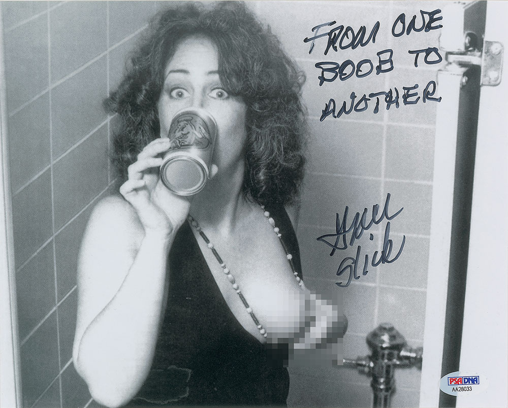 Cheeky satin-finish 10 x 8 photo of Slick revealing her breast in a bathroom stall while drinking a beer, signed in black felt tip, “From one boob to another, Grace Slick.” In fine condition, with a stain to lower left. Accompanied by a certificate of authenticity from PSA/DNA. Pre-certified REAL.