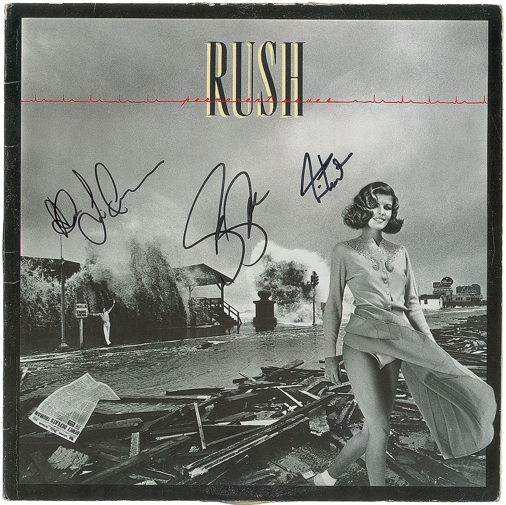 Permanent Waves album signed in black felt tip by Geddy Lee, Neil Peart, and Alex Lifeson. In fine condition. The record is included. Pre-certified REAL.
