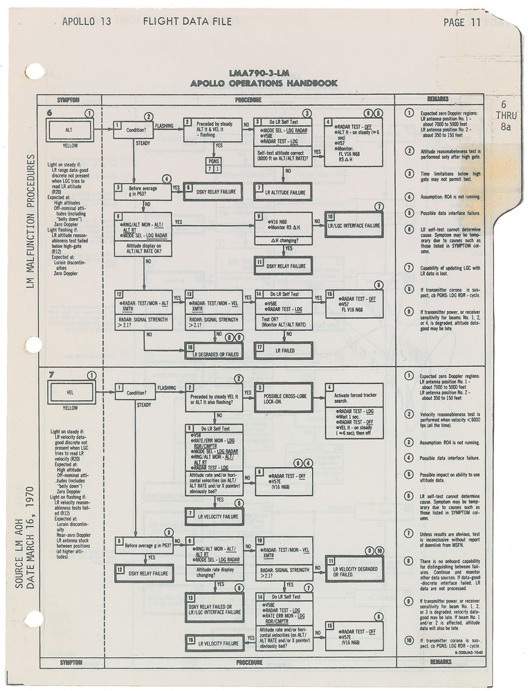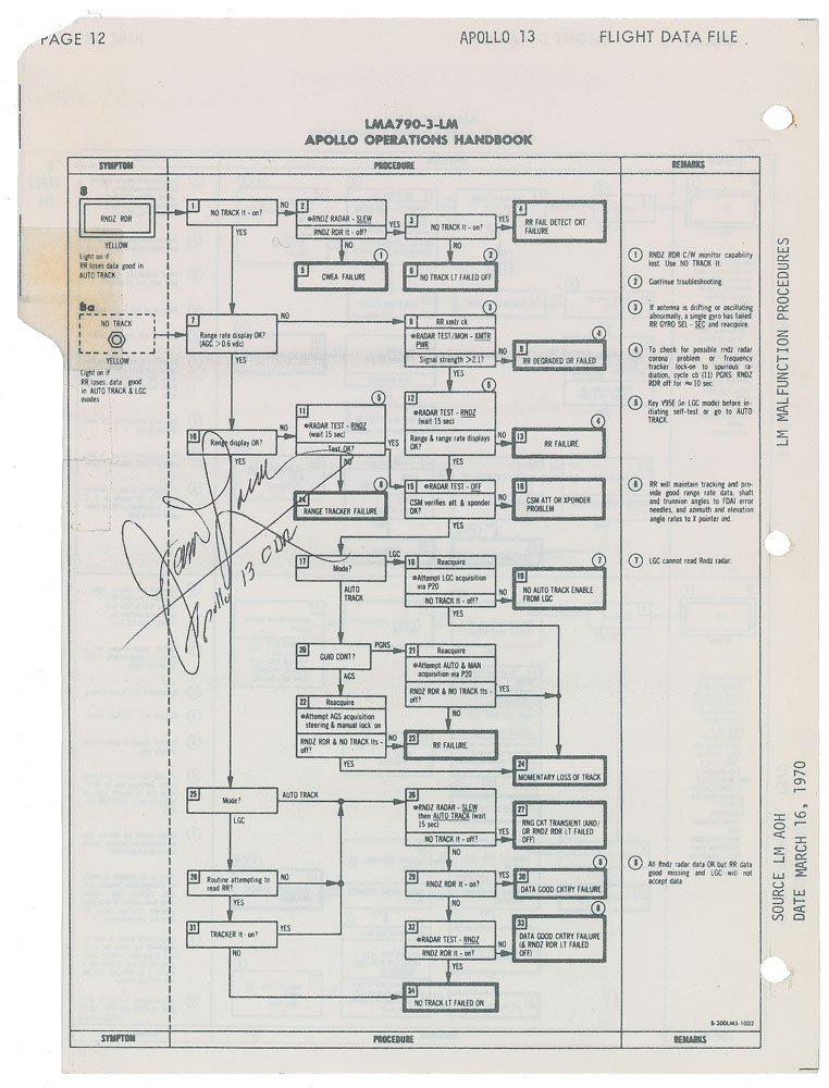 Flown double-sided checklist page carried on board Apollo 13, headed “LMA790-3-LM, Apollo Operations Handbook,” pages 11–12 from the “Apollo 13 Flight Data File,” 8 x 10.5, signed in black ballpoint, “James Lovell, Apollo 13 CDR.” The page is from the ‘Primary Navigation Guidance System’ section of the manual and labeled “LM Malfunction Procedures” in the right margin, with the signed side providing a flow chart for troubleshooting malfunctions in the LM Rendezvous Radar. The opposing side provides other diagnostic steps for the spacecraft’s radar systems. In fine condition. Accompanied by a data CD and certificate of authenticity attesting to the page’s provenance and a COA from the Astronaut Scholarship Foundation. Flown items from Apollo 13 are extremely popular and less common than those from many other missions. Given the fame of the Apollo 13 spacecraft’s failure, this page concerning malfunctions has particular appeal. Pre-certified Zarelli Space Authentication.