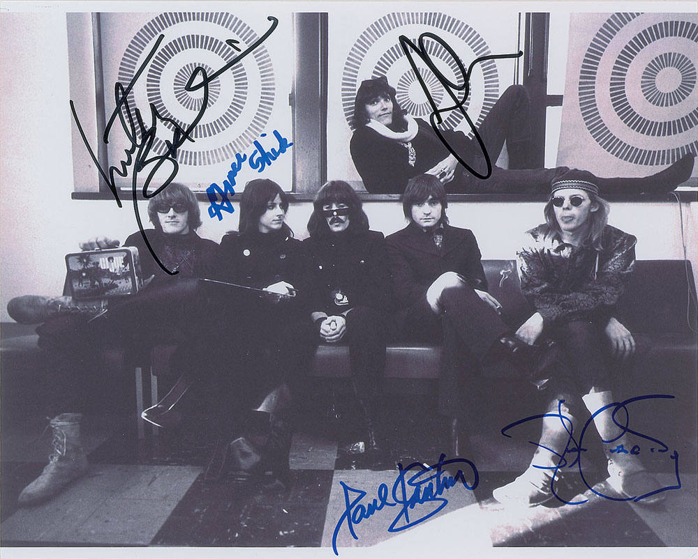 Glossy 10 x 8 photo of the band seated in front of some psychedelic artwork, signed in blue and black felt tip by Grace Slick, Paul Kantner, Marty Balin, Jack Casady, and Jorma Kaukonen. In fine condition. Pre-certified REAL.