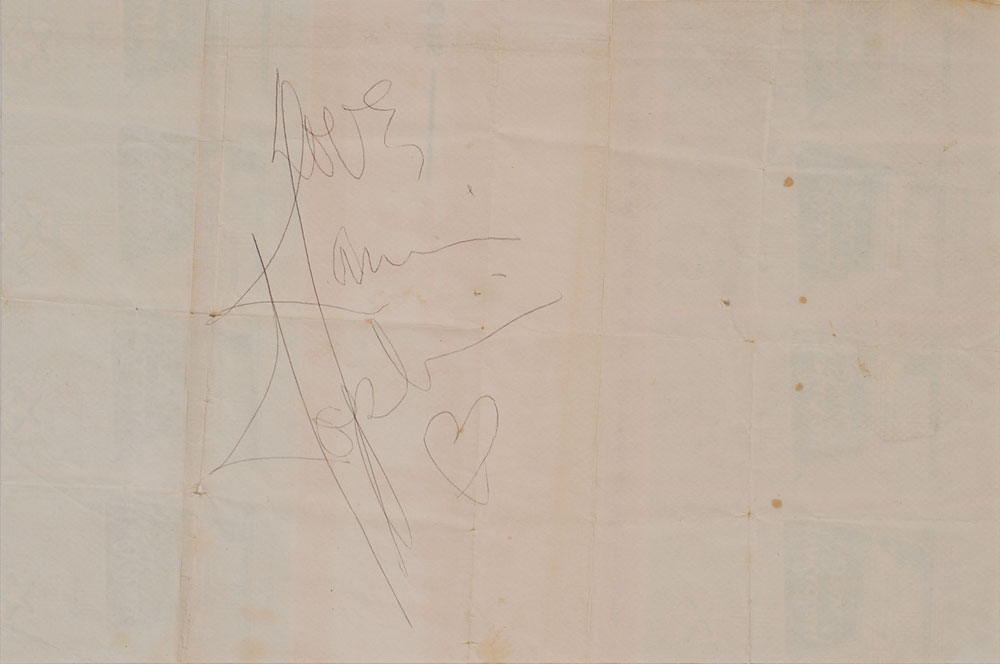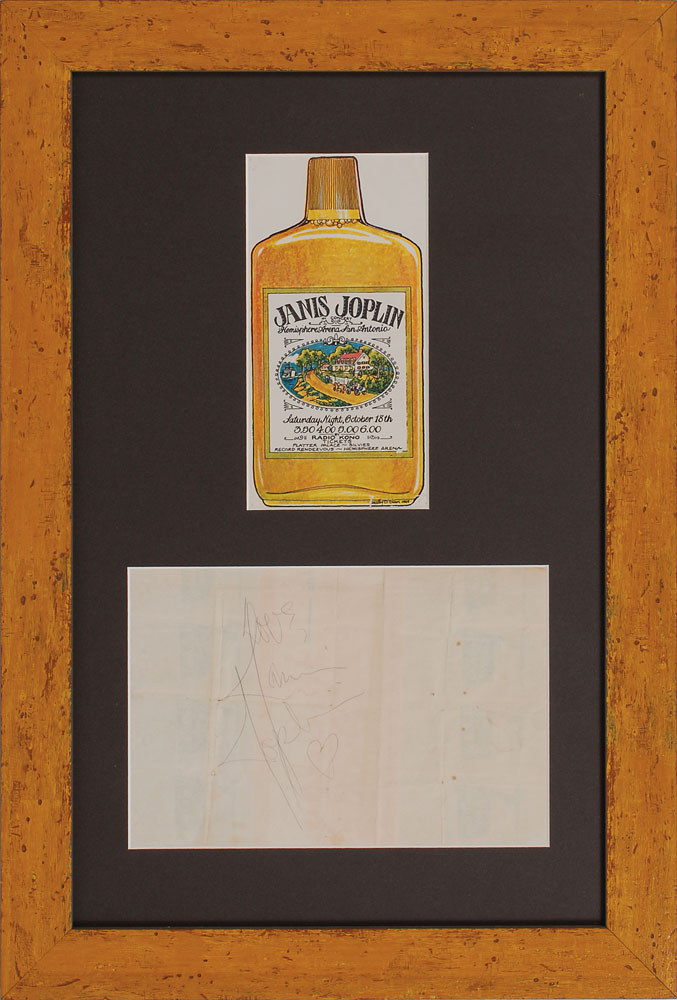 Ballpoint signature, “Love, Janis Joplin,” who adds a small heart on an off-white 9 x 6.25 sheet. Framed with an original handbill for her October 18, 1969, show in San Antonio to an overall size of 14.75 x 21.75. In very good condition, with overall wrinkling and several intersecting folds, and show-through from text on reverse. Pre-certified REAL.