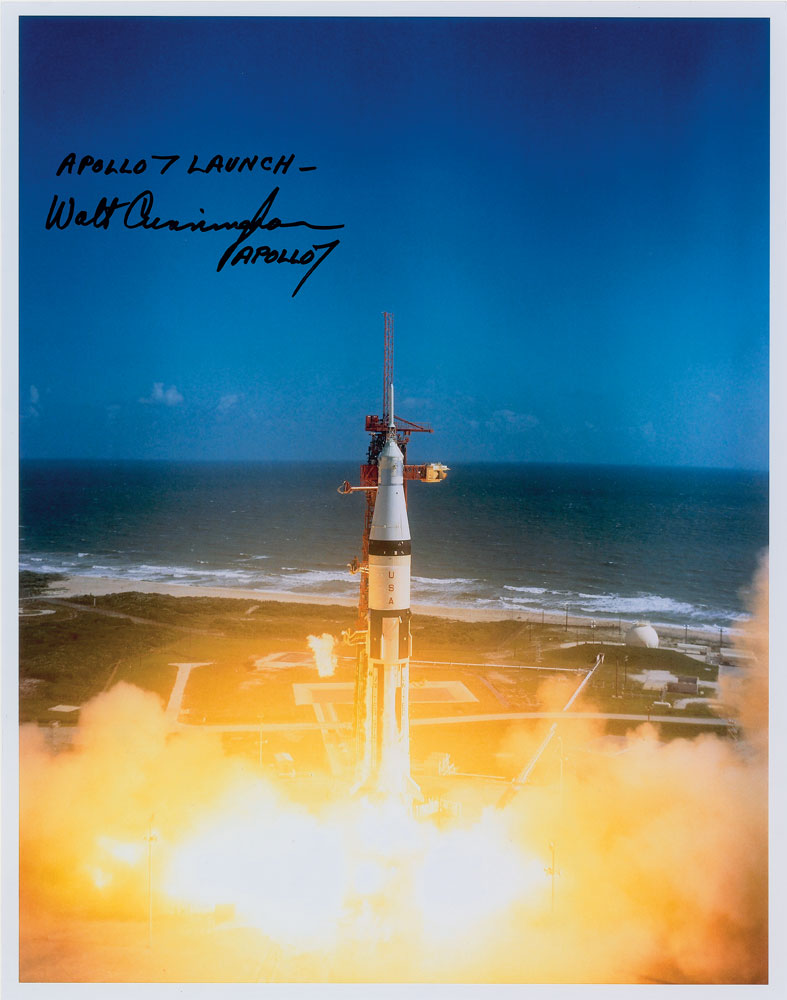 Vibrant color glossy 11 x 13.75 photo of a Saturn rocket blasting off from Cape Canaveral, signed in black felt tip, “Apollo 7 Launch—Walt Cunningham, Apollo 7.” In fine condition. Pre-certified Zarelli Space Authentication.
