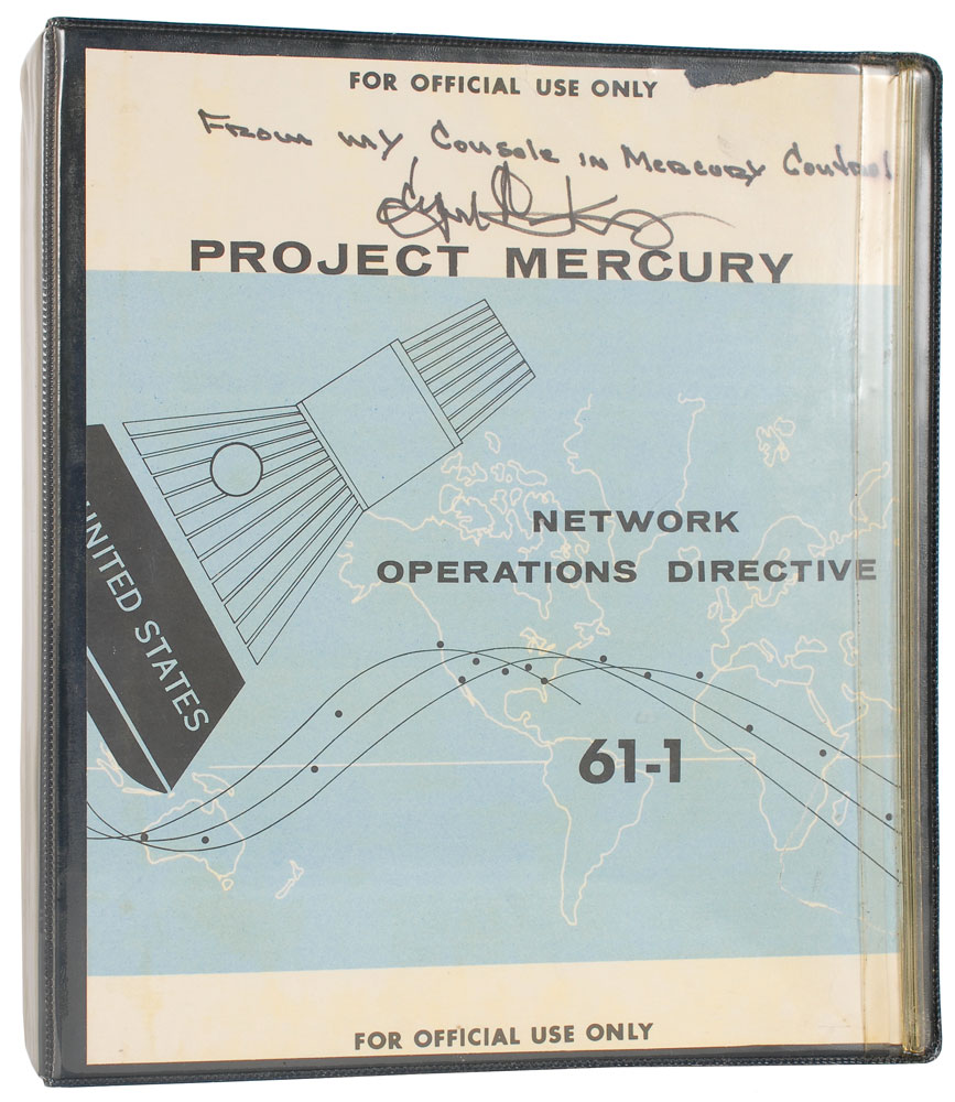 Gene Kranz’s personally-owned and -used Project Mercury manual entitled “Network Operations Directive 61-1,” 11 x 10, November 30, 1961, signed on the front cover in black felt tip, “From my console in Mercury Control, Gene Kranz.” The first page is headed “For Official Use Only” on the cover and “Copy No. 30” on the first page, and the manual consists of a general overview of a variety of topics and operations procedures, including: “Concept of Operations,” “Network Operations Procedures,” “Radar Systems,” “Telemetry Plan,” “Command Control Plan,” “Radio Interference Protection,” “Communications Plan,” “Data Handling Plan,” “Analog and Digital Systems,” “Logistics,” “Failure Analysis,” “Maintenance Procedures,” “Weather,” and others. The manual bears a few small handwritten annotations throughout. In very good to fine condition, with a small bit of paper loss to upper edge of the cover and toning to front binder plastic. Kranz’s first position with NASA was as a Mission Control procedures officer for the unmanned Mercury-Redstone 1 test, a position which saw him integrating Mercury Control with the Launch Control Team at Cape Canaveral, Florida, as well as creating the "Go/NoGo" procedures that allowed missions to proceed as planned or be aborted. Kranz performed this role for all unmanned and manned Mercury flights, and was later promoted to Assistant Flight Director for the flight of MA-7. A wonderful signed working manual from the personal collection of the man who helped coordinate the safety of America’s earliest astronauts. Pre-certified Zarelli Space Authentication.
