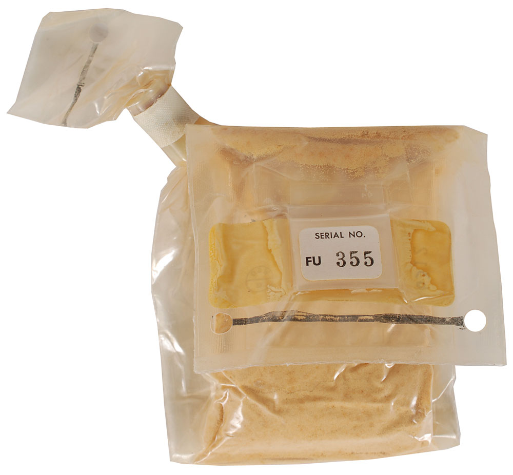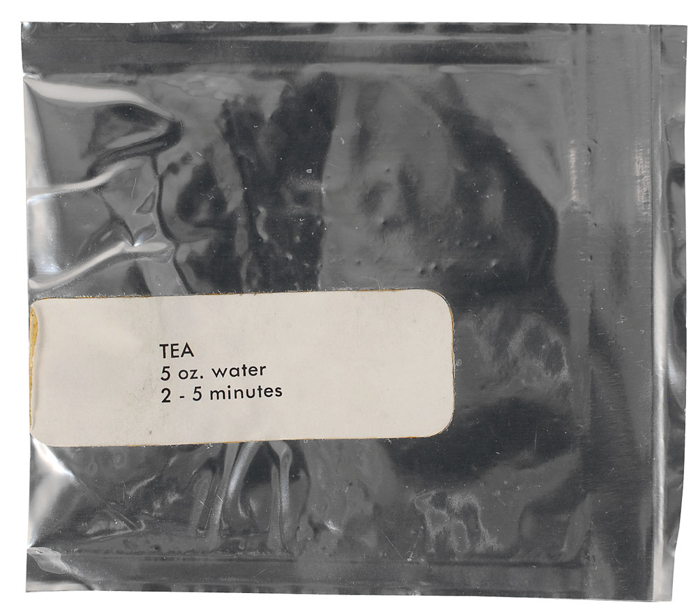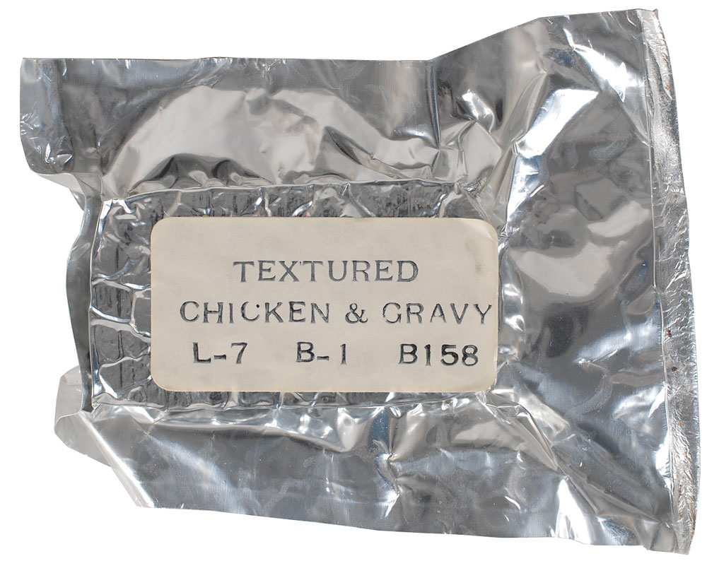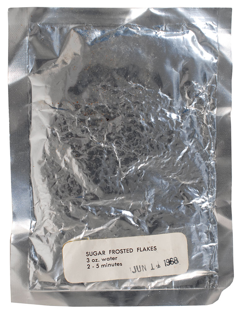 Set of four aluminum packets of Apollo-era space food, with cuisine including: textured chicken and gravy, labeled “L–7, B–1, B158”; sugar frosted flakes, labeled “3 oz. water, 2—5 minutes,” and stamp–dated June 14, 1968; tea, labeled “5 oz. water, 2—5 minutes”; and pea soup, labeled “5 oz. hot water, 5—15 minutes,” stamped “6132, WSD/13,” with a serial number on the reverse, “FU, 355.” Also includes a single round germicide tablet. In overall fine condition. Accompanied by a signed certificate of authenticity from Walt Cunningham indicating that the food originates from his personal collection.