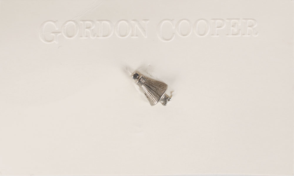 Gordon Cooper’s silver-colored Mercury capsule tie tack, measuring .75 x .25, and attached to an embossed personal stationery card. In fine condition. Accompanied by a signed letter of authenticity from Cooper, in part: “Displayed on my stationary [sic] card is a tie tack in the shape of a Mercury spacecraft…My earth orbital flight which I named ‘Faith 7’ was the last and the longest mission of the Mercury Program.”