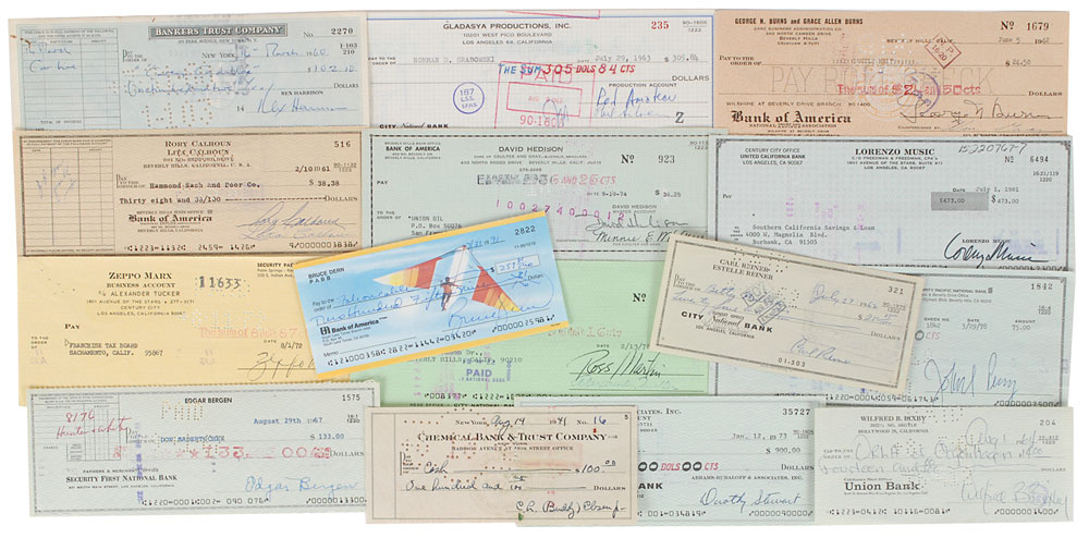 Collection of fifteen personal and bank checks, each signed by an actor, including: Rex Harrison, Phil Silvers, George Burns, Rory Calhoun, David Hedison, Lorenzo Music, Zeppo Marx, Ross Martin, Bill Bixby, Bruce Dern, Carl Reiner, Edgar Bergen, Buddy Ebsen, Jim Hutton (endorsed only), and Robert Lansing (endorsed only). In overall fine condition.