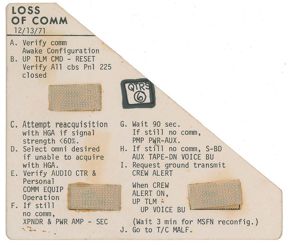 Triangular double-sided cue card used during Apollo 16 training, 5.5 x 4.75, dated December 13, 1971. Labeled on each side in black felt tip, “Qtrs 6,” the card bears headings for “Loss of Comm” and “AC Pwr.” Small swatches of Velcro affixed to both sides. In fine condition.